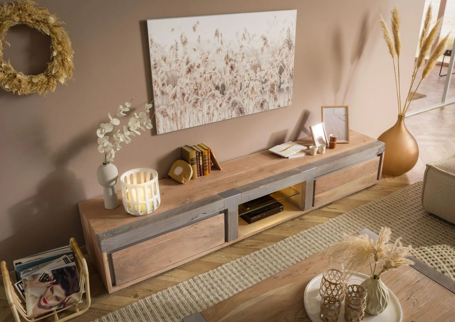 Elemento di richiamo per spazi abitativi moderni, questo mobile TV fonde elegantemente legno di acacia, metallo e travi ricavate da legno riciclato. Le superfici sabbiate non solo spiccano per carattere, ma mettono in luce crepe e venature naturali, conferendo al mobile una straordinaria sensazione tattile.