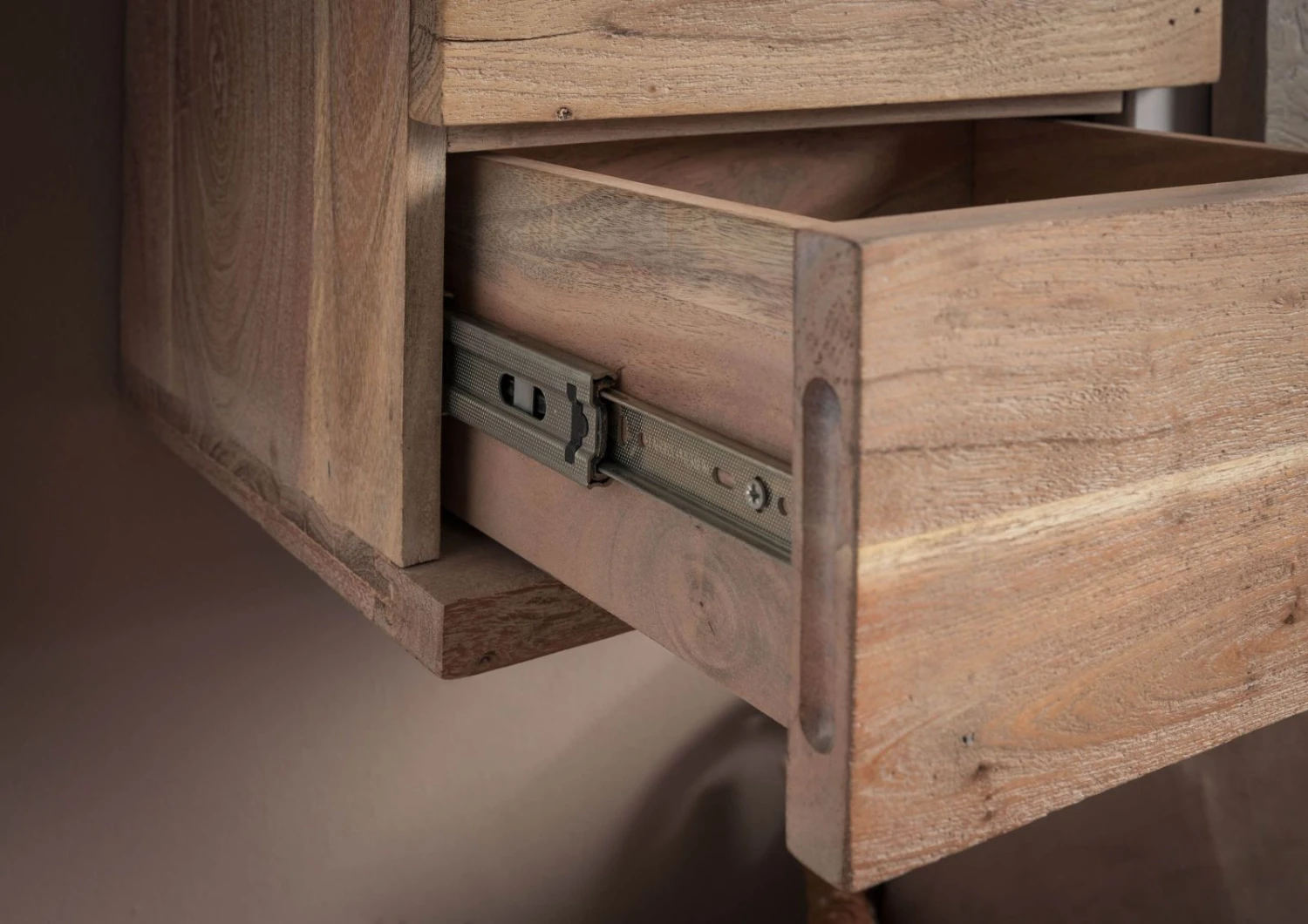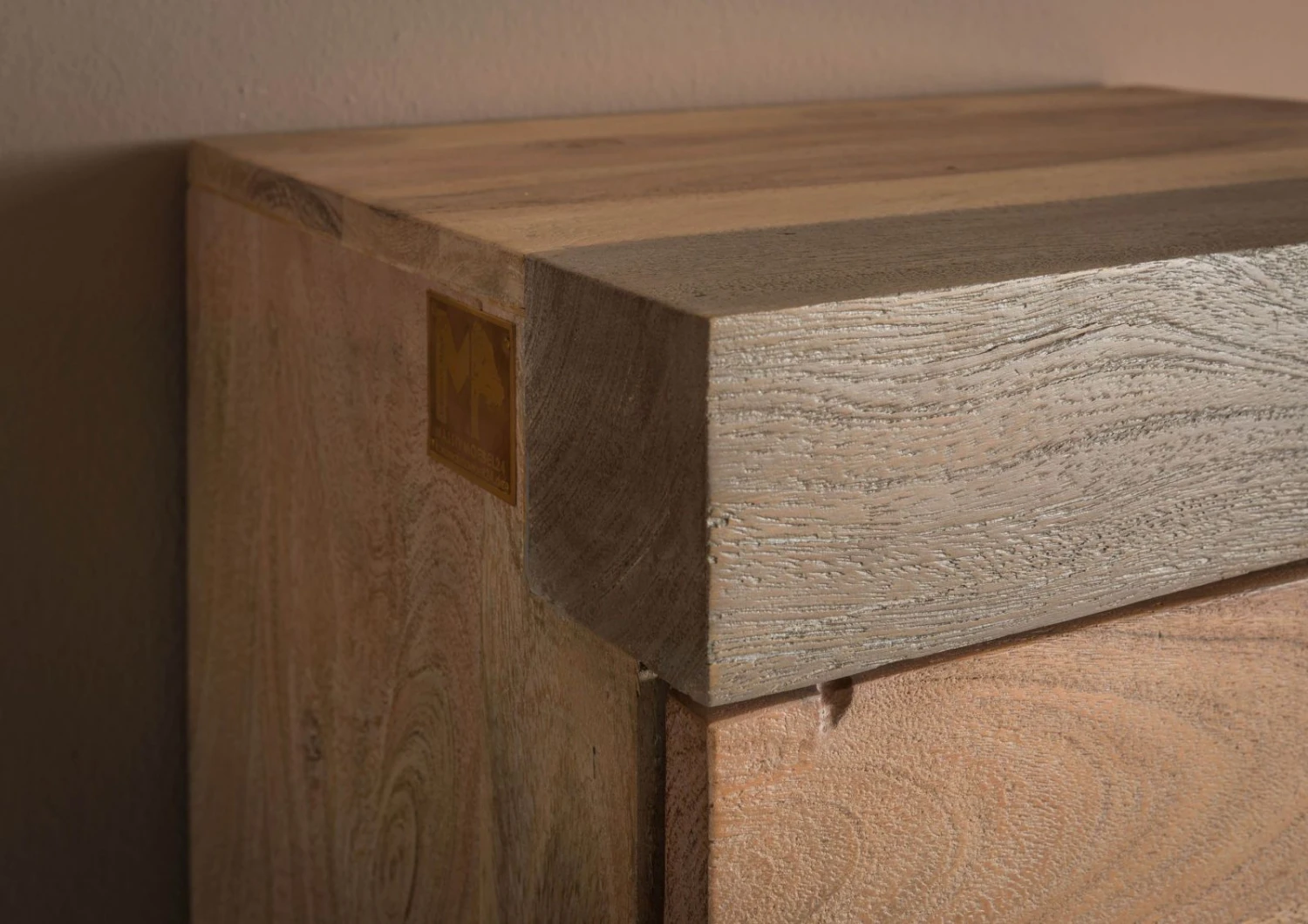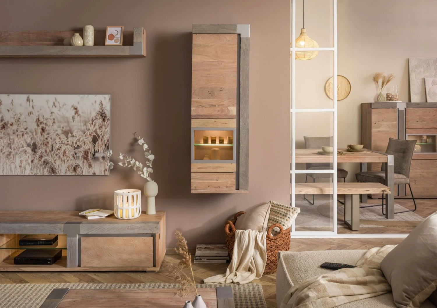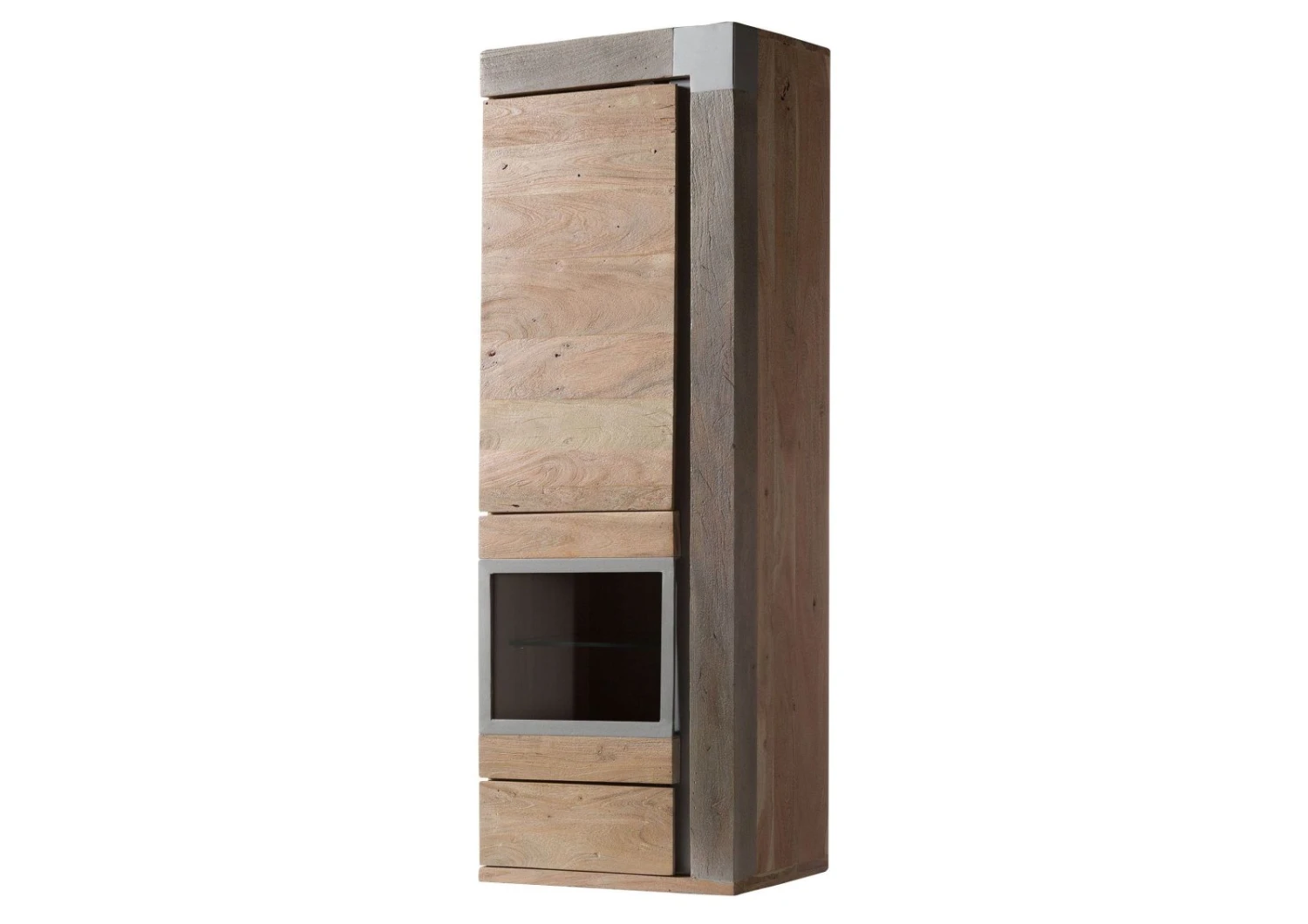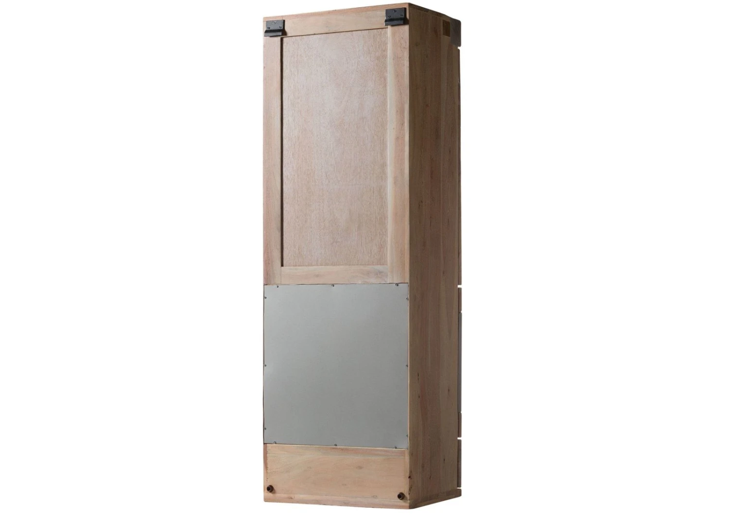 Questa vetrinetta pensile unisce spazio e stile in un unico pezzo d’arredo. Il design dalle linee puriste è valorizzato da maniglie occultate e da un insolito abbinamento di materiali: mentre corpo e frontali sono realizzati in legno di acacia sabbiato, la cornice include rustiche travi di recupero.
