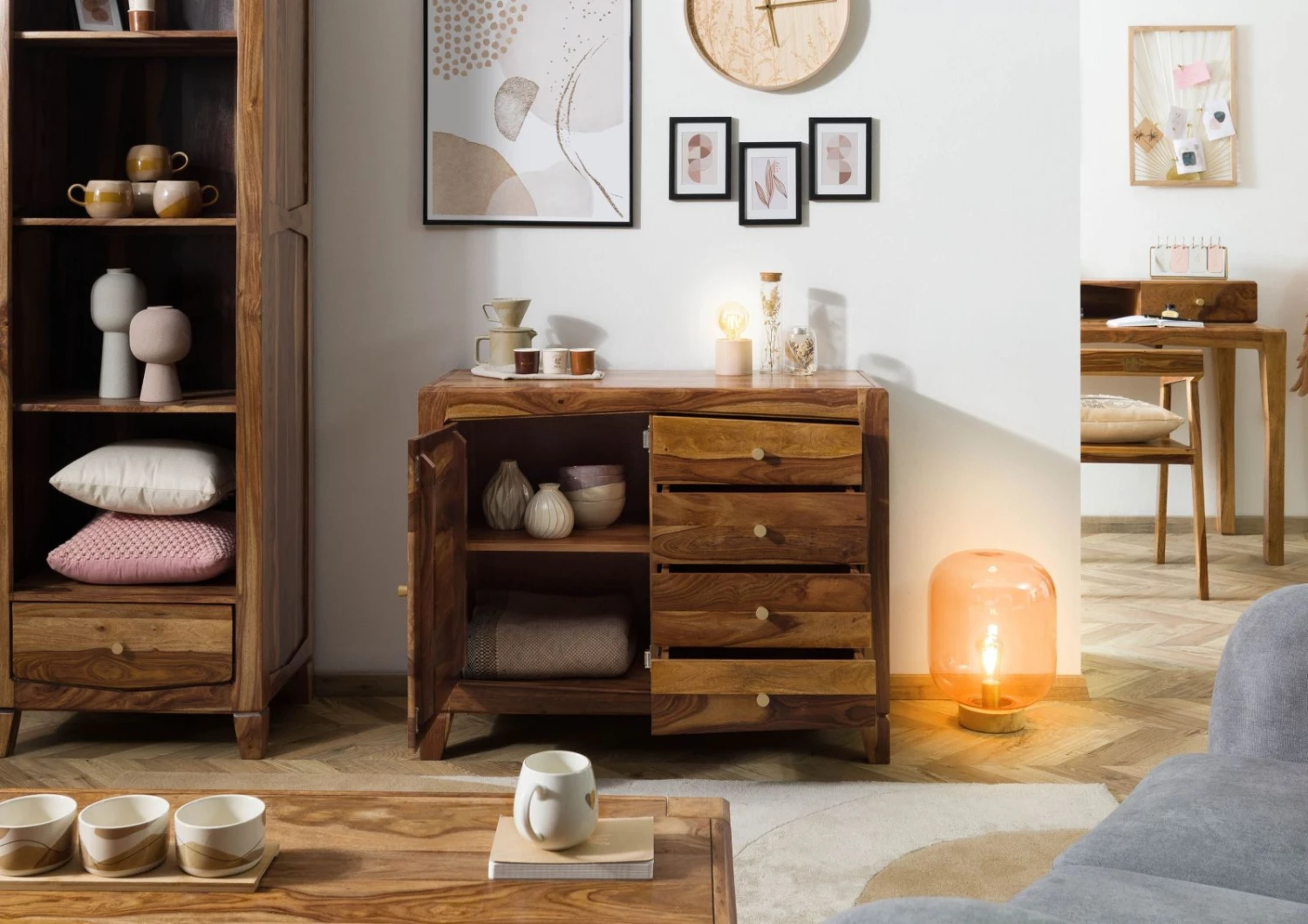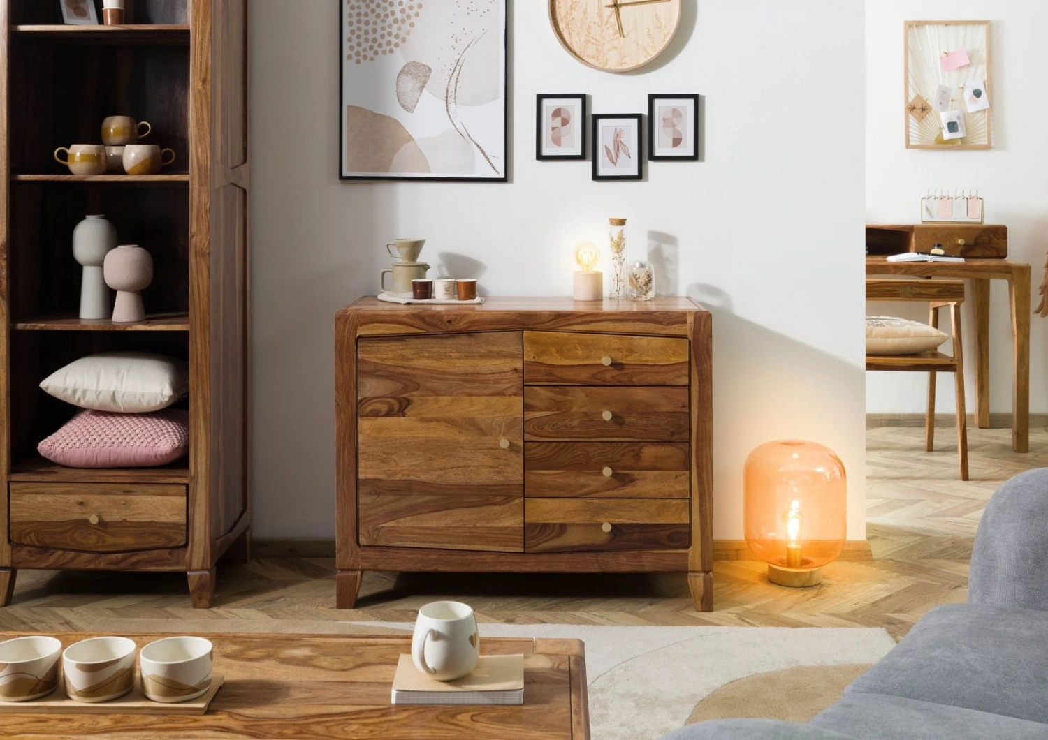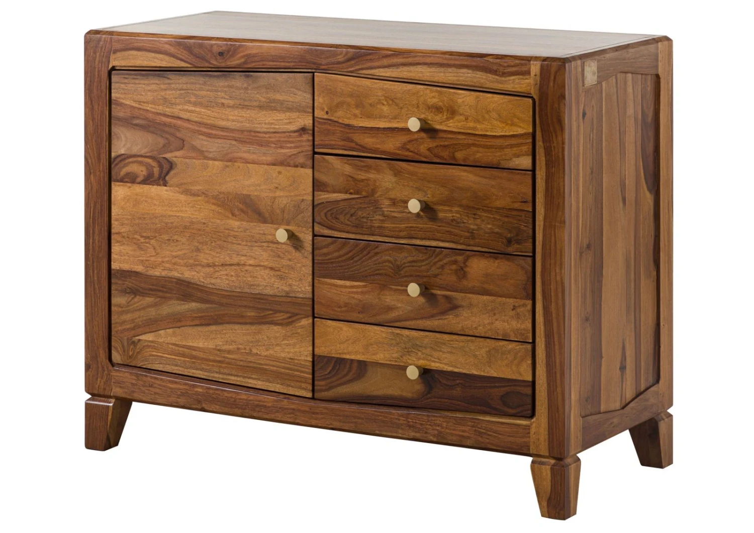 Le dimensioni compatte e l’ampia capienza fanno di questo comò in solido palissandro indiano, noto anche come sheesham, il mobile perfetto per piccoli spazi abitativi. In appena 100x45x80 cm, presenta addirittura quattro cassetti, più altri due vani elegantemente celati da un’anta con chiusura magnetica. Oltre che per funzionalità, il mobile colpisce anche per il gradevole design.