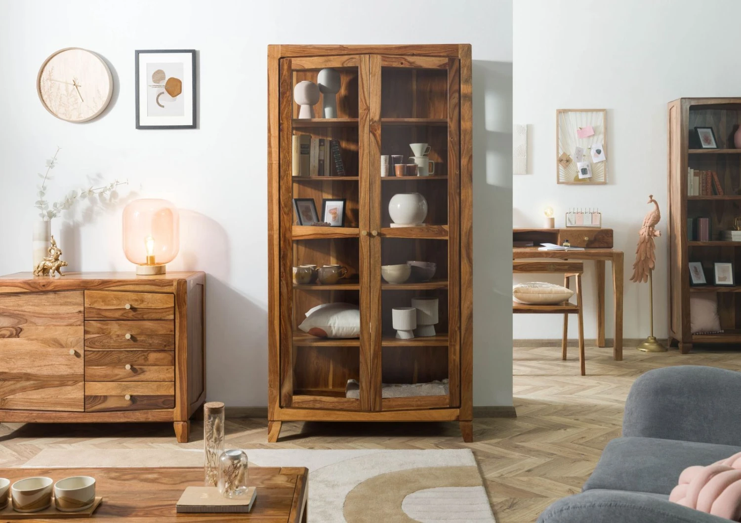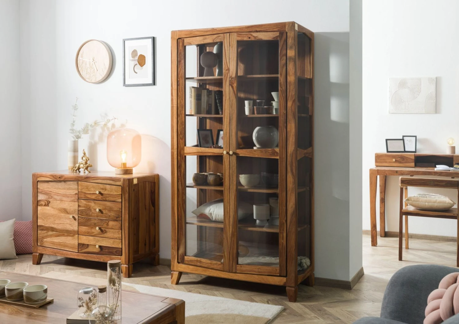 Vetrina in sheesham massiccio: il legno vero incontra il vetro