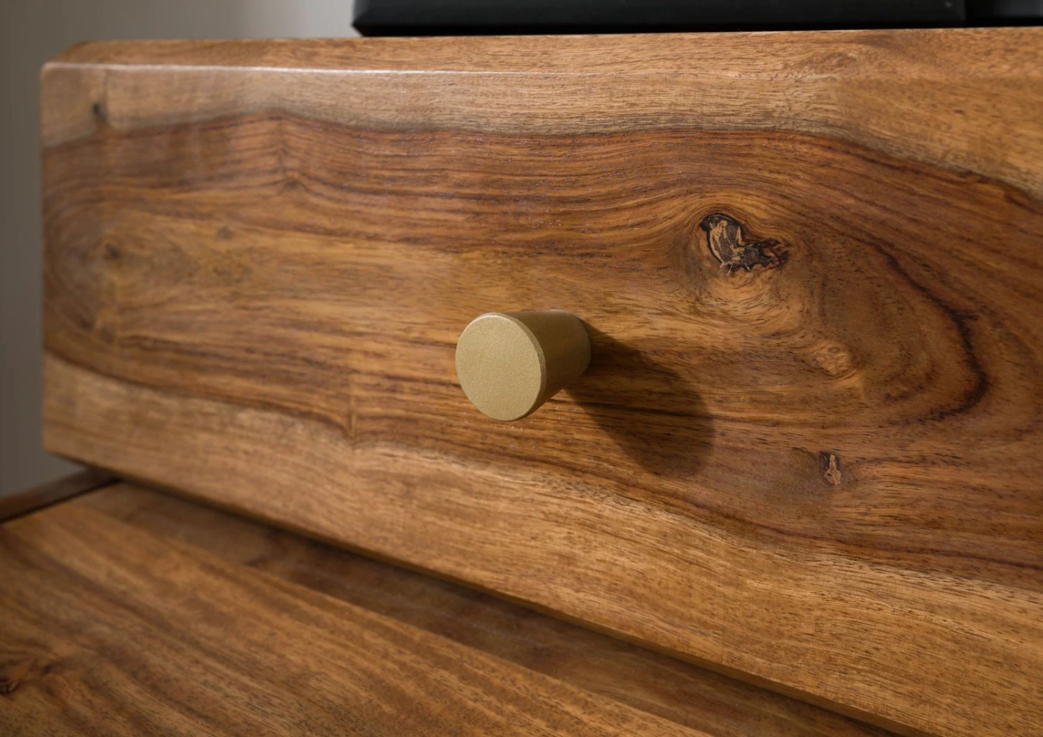 - Dettagli eleganti: gambe sottili, pomelli in metallo e bordi bisellati