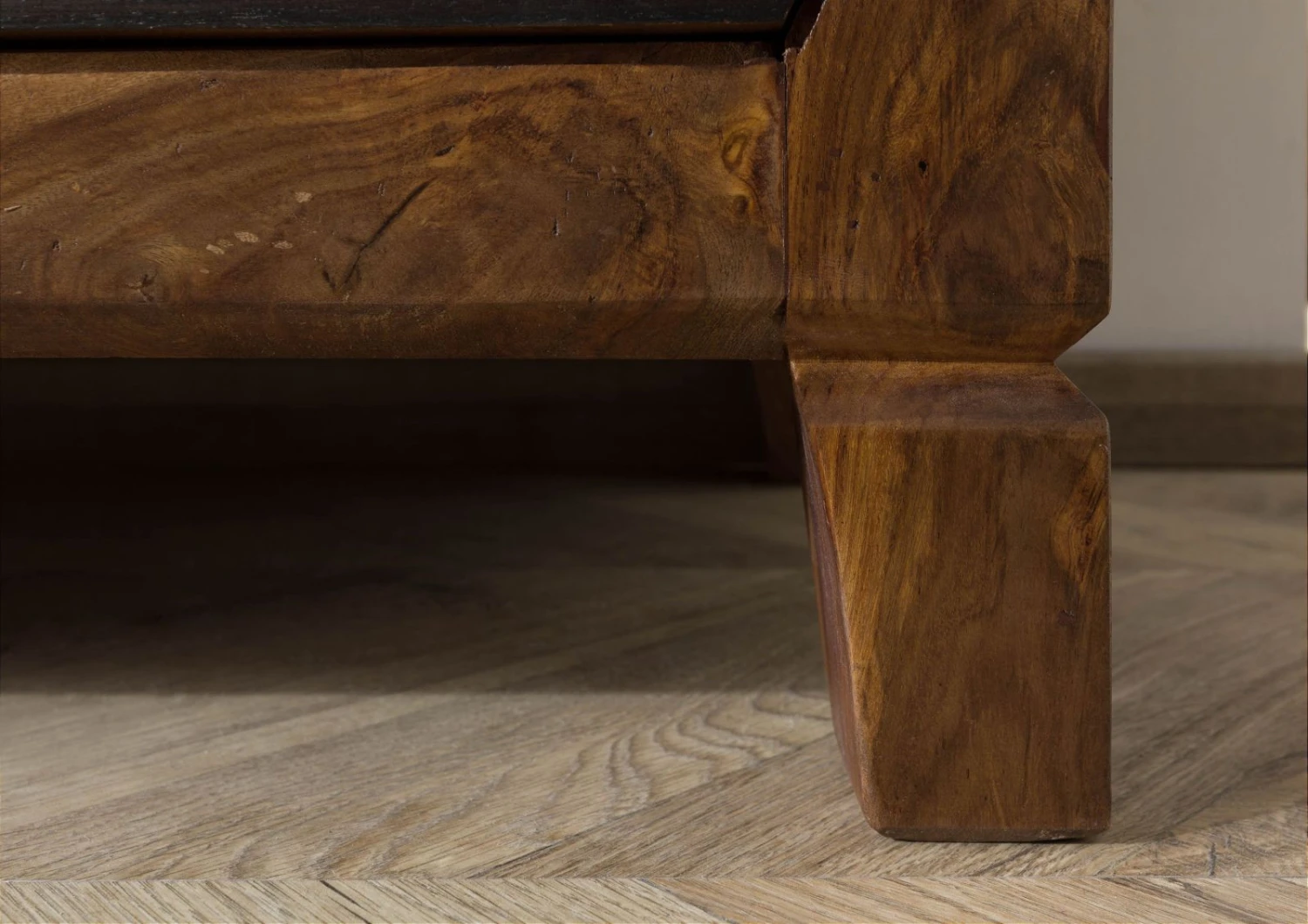 Questo mobile TV celebra la diversità del legno di sheesham. Questo mobile in legno massiccio della gamma ANCONA colpisce per il sorprendente aspetto di questo materiale naturale con venature particolari e accenti neri. Lo sheesham, noto anche come palissandro indiano, dona al design classico quel qualcosa in più e rende ogni mobile un vero pezzo unico.