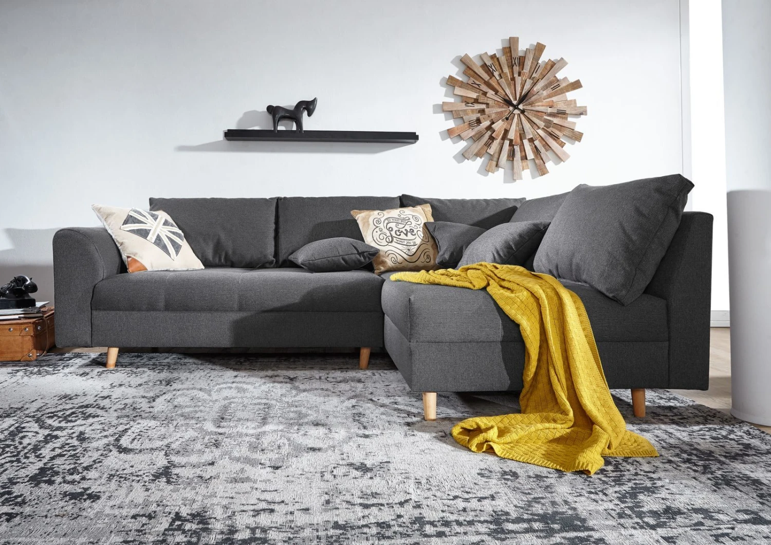 – Altezza seduta: 40 cm – Profondità seduta: 90 cm – Profondità seduta con cuscini: 53 cm – Altezza senza cuscini: 65 cm – Rivestimento: 100% polipropilene – Imbottitura: schiuma PU, molle greche – Struttura: legno / truciolato – Piedi: legno naturale – Cuscini per lo schienale riempiti di granuli Perfetto per una casa in stile nordico: il divano angolare ARIELLA colpisce per il suo aspetto caldo e accogliente. I morbidi cuscini dello schienale, inclusi nella fornitura, invitano a rilassarsi. L’imbottitura in schiuma che non si sforma della seduta rende questo divano angolare il posto preferito in salotto. Il divano è rifinito da diversi dettagli di design che potrebbero sfuggire a un primo sguardo, come la seduta trapuntata, le cuciture decorative sui braccioli e i piedi in legno del divano dal design scandinavo di tendenza.