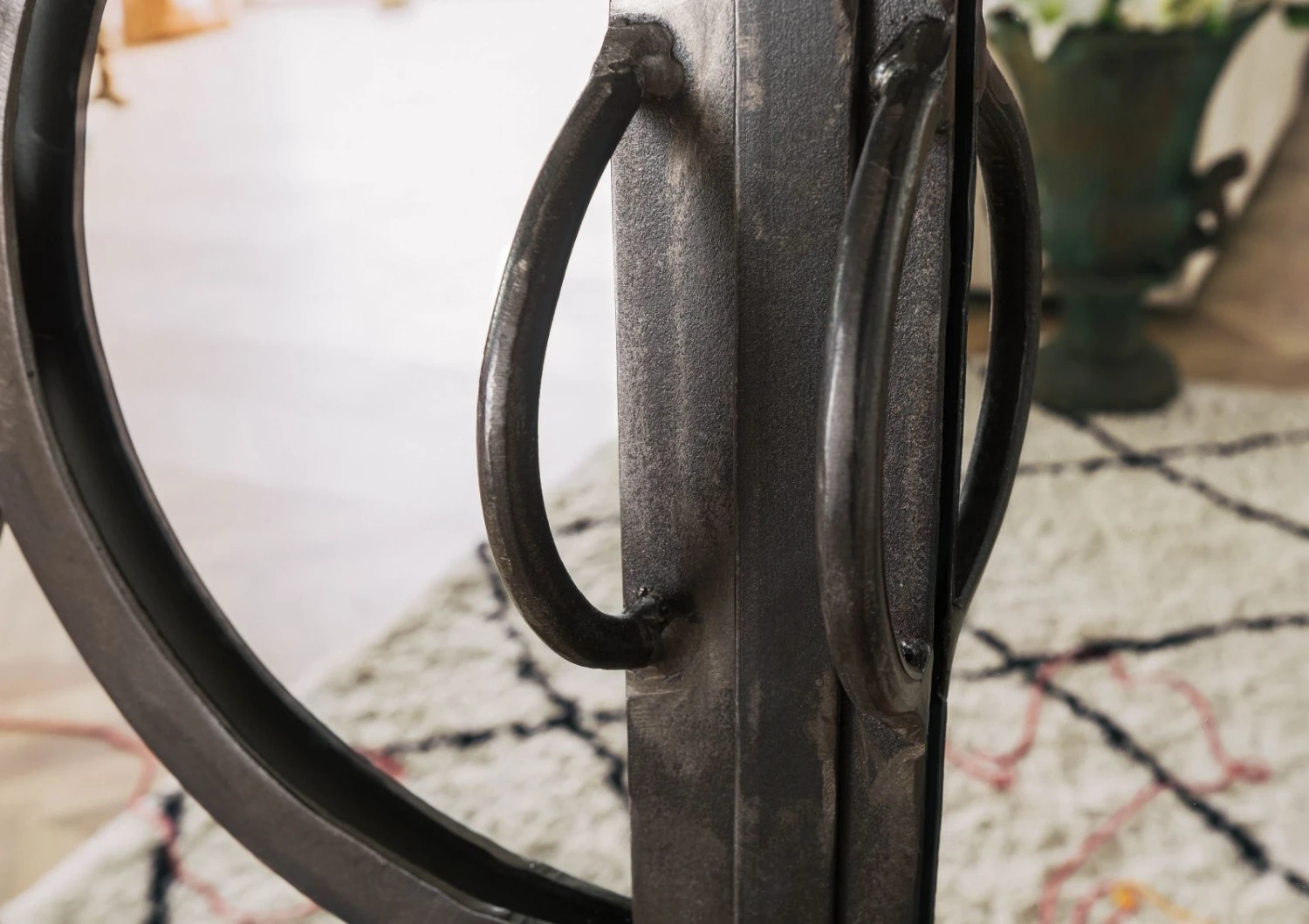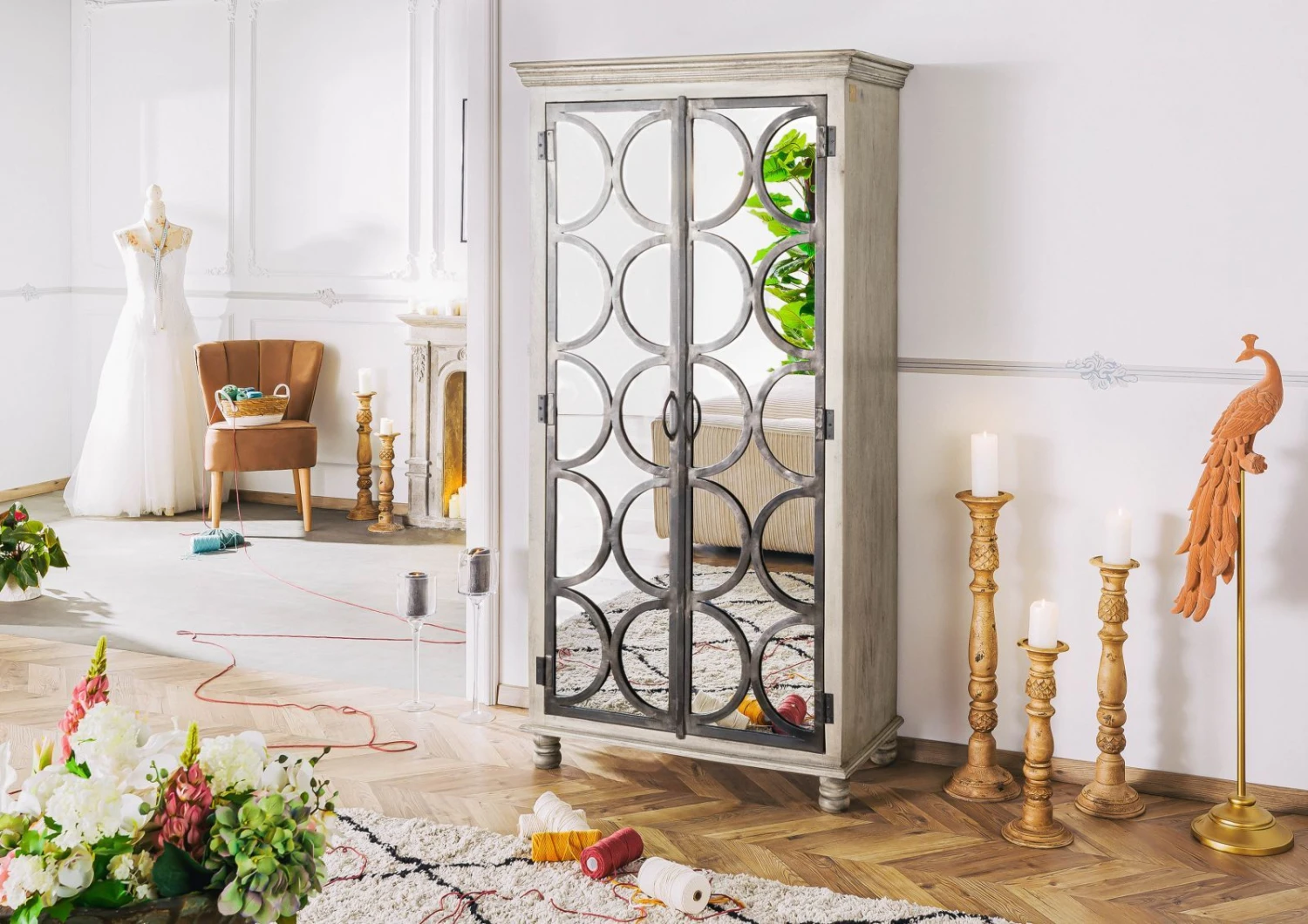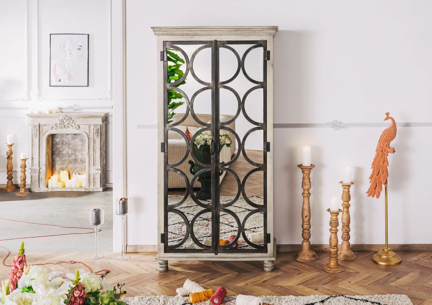 Questo particolare armadio è mosso da un vibrante stile vintage con una splendida finitura laccata grigia che lascia intravedere la struttura del legno. Gli elementi semicircolari in metallo sulle ante a specchio evocano gli anni Venti e l’art déco. Tra le altre citazioni figurano i piedi a forma sferica e la bordatura decorativa tipici dello stile country.