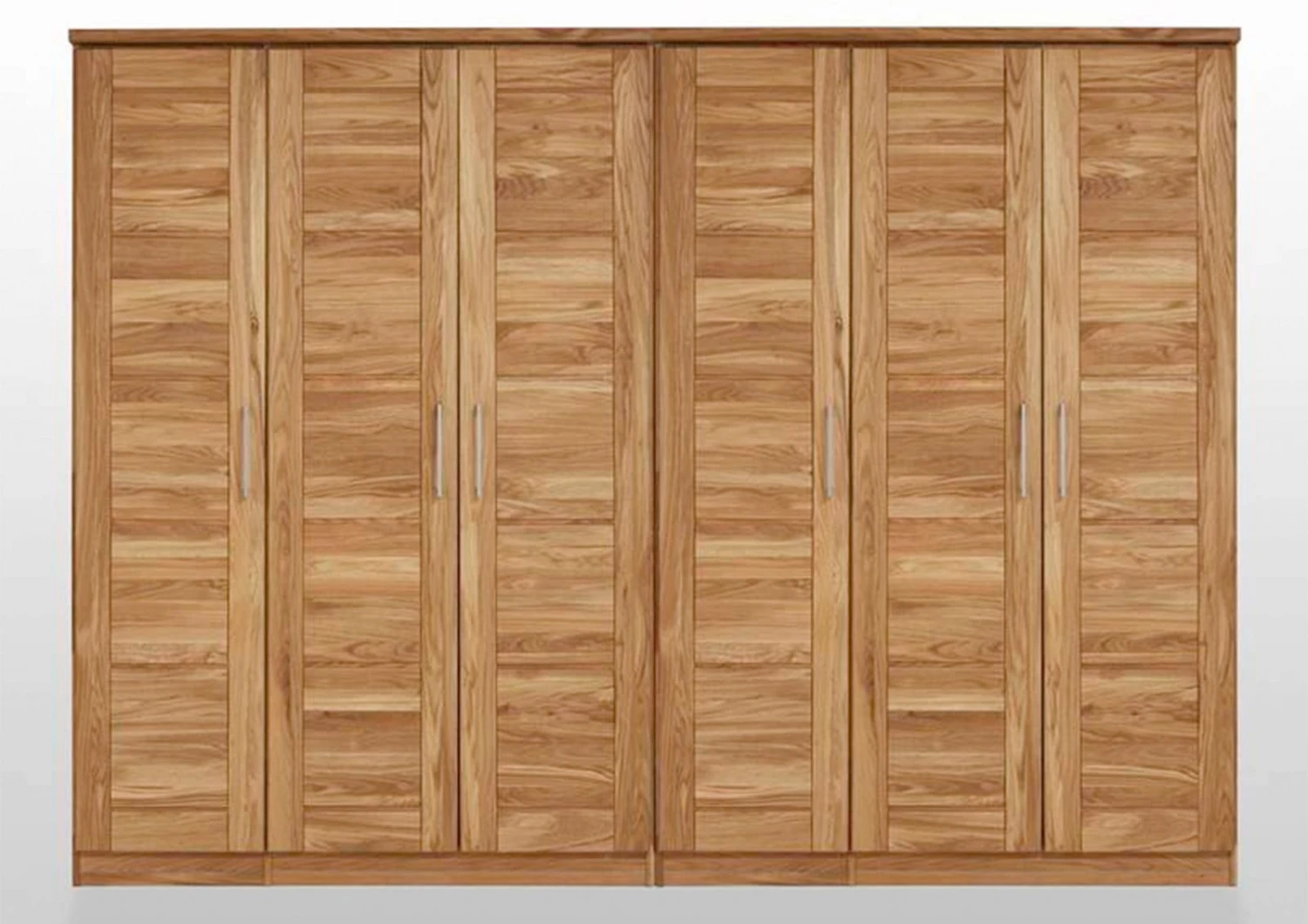 Grande armadio in legno massello di quercia selvatica (rovere) a sei ante, color ocra mista e marrone scuro con superficie naturale ed effetto oliato. Un arredo davvero imponente con ben tre sezioni riservate allarchiviazione e al contenimento organizzate in rispettivi vani appendiabiti e cappelliere. Ogni scomparto è predisposto con aste per grucce ed è inoltre possibile aggiungere altri accessori per diverse personalizzazioni. Lestetica semplice è suggestiva viene esaltata dalla combinazione di discromie verticali e listelli orizzontali che rivelano le sezioni più interne del materiale. Nonostante le dimensioni imponenti larmadio in legno massello di quercia selvatica risulta molto stabile grazie alla solida base a zoccolo chiuso, e le maniglie in metallo aggiungono un tocco di modernità ad un design minimale e funzionale.
