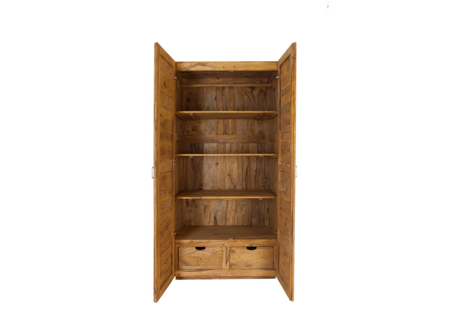 Il colore originale del nucleo centrale del legno viene lasciato quasi inalterato in questa collezione, ad eccezione di un trattamento finale con olio di color marrone. In questo modo, si ottiene una combinazione di colore unica ed una struttura entusiasmante e la tipica venatura del legno Sheesham ne viene esaltata in modo particolare. La grande robustezza e lo spessore del legno si adattano particolarmente a mobili di grandi dimensioni, come questo armadio della serie NATURE BROWN. L’offerta complessiva di questa serie dà numerose opportunità di abbinamenti, in soggiorno o in camera da letto. Inoltre, questo armadio, grazie al suo design, può adattarsi anche ad abitazioni arredate in stile moderno o può dare un tono particolare a mobili già presenti in casa. L’armadio a due porte NATURE BROWN non offre soltanto molto spazio per il vostro abbigliamento, con i suoi 4 scaffali e 2 cassetti ma, grazie al suo moderno design ed al suo colore naturale, conferirà ai vostri ambienti anche un’atmosfera particolare e confortevole. Gli scaffali possono anche essere rimossi e la parte superiore dell’armadio può essere dotata di una stanga alla quale appendere i vestiti. Le maniglie delle portelle sono discrete, mentre quelle dei cassetti sono direttamente ricavate nel legno e non distolgono l’attenzione dall’aspetto complessivo dell’armadio. Se disponete di un ambiente sufficientemente ampio, avrete anche la possibilità di unire diversi armadi uno accanto all’altro, per aumentare lo spazio per i vostri vestiti, sfruttare al meglio gli spazi interni e dare alla vostra stanza un aspetto accogliente.