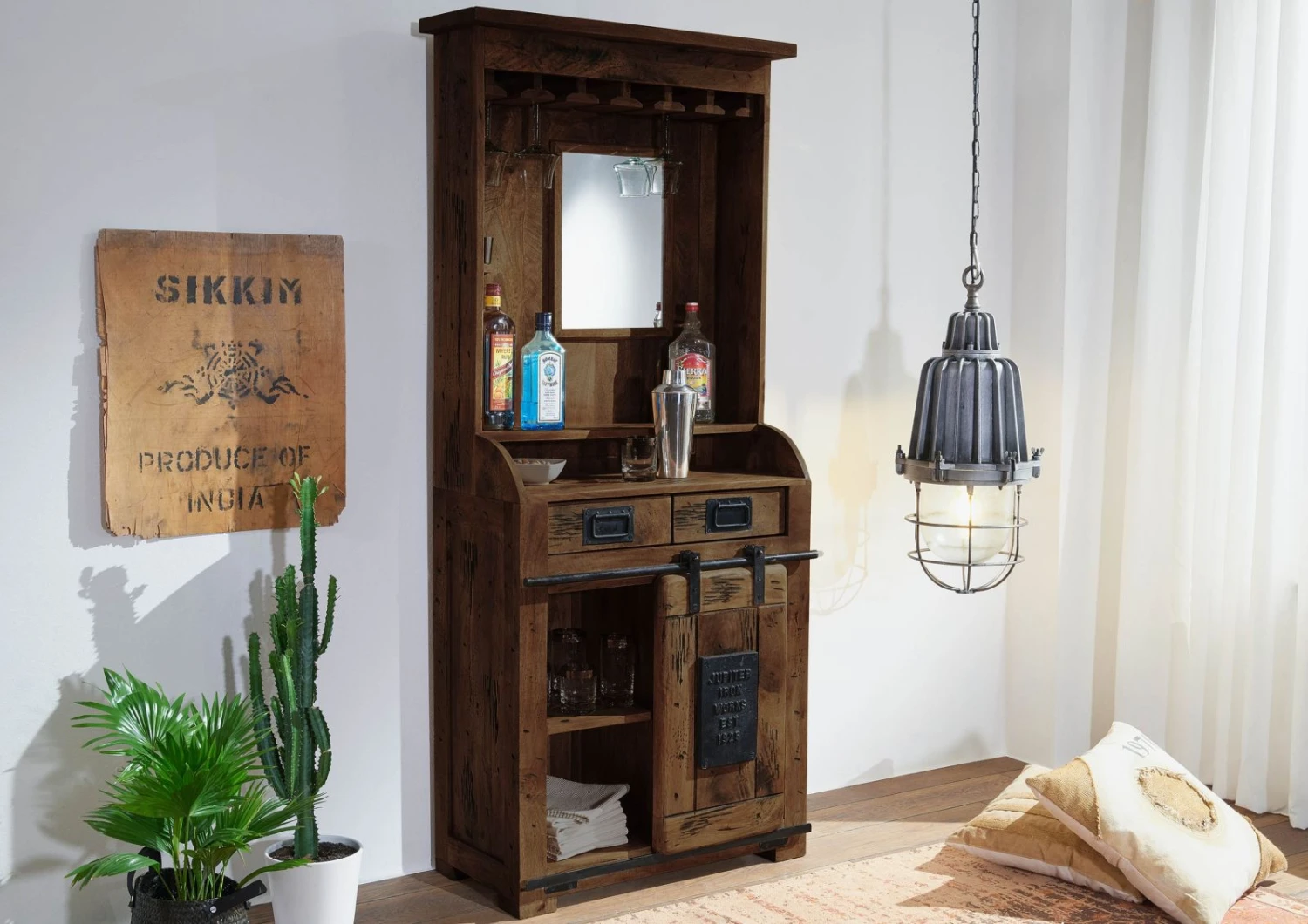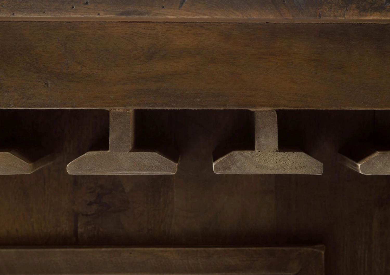 Questo mobile bar della collezione RAILWAY è la scelta ideale per gli amanti del buon bere. Realizzato in legno massello non è sono bello da vedere, ma offre tutto lo spazio necessario per riporre l’occorrente per la preparazione di gustose bevande. È dotato di quattro scomparti interni, due cassetti, un ripiano intermedio e supporti portabicchieri. Dispone anche di uno spazio per tovaglioli, bicchieri e shaker.