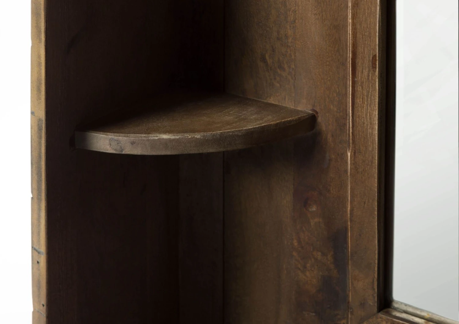 Il mobile è realizzato in legno massello di mango. L’aspetto usato della superficie in legno conferisce all’insieme un carattere accogliente. I numerosi dettagli in ferro scuro emanano un fascino industriale. Lo specchio integrato in posizione centrale moltiplica lo spazio, dando aria al soggiorno o alla stanza riservata alle attività ricreative.