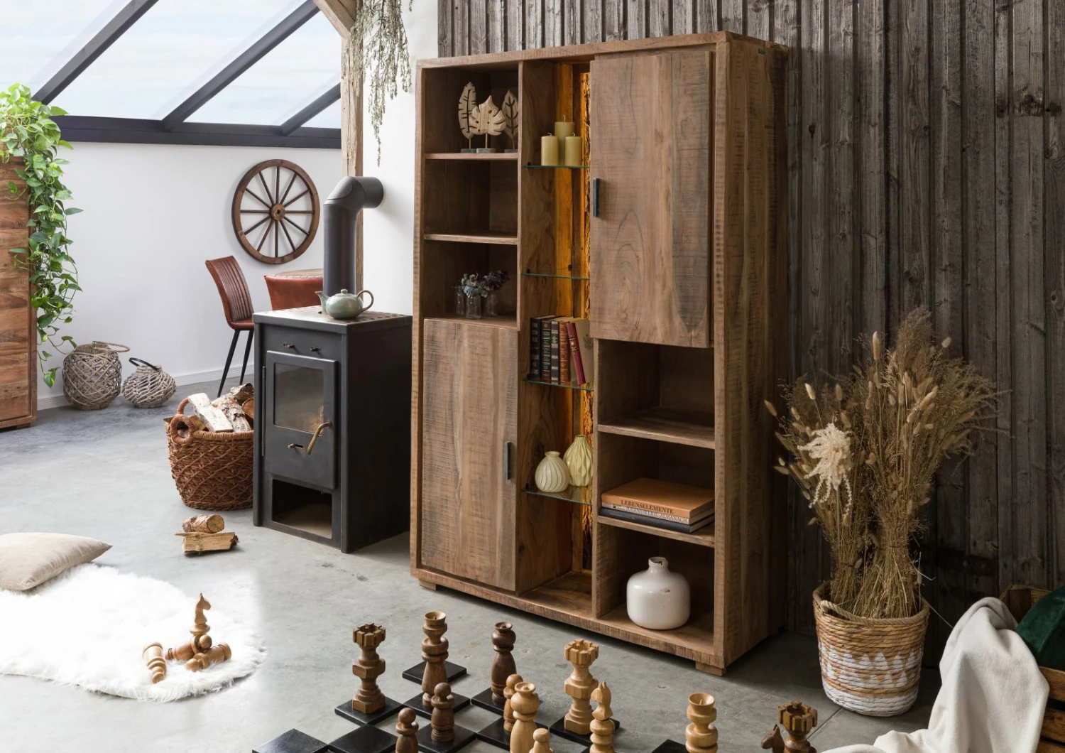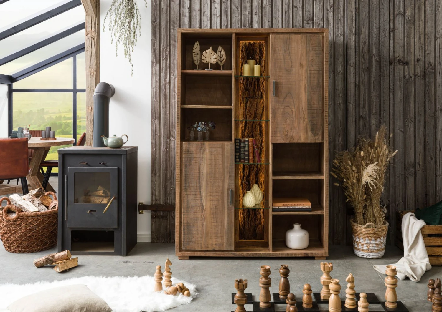 In un mobile improntato al design, il legno massello di acacia incontra la vera corteccia d’albero