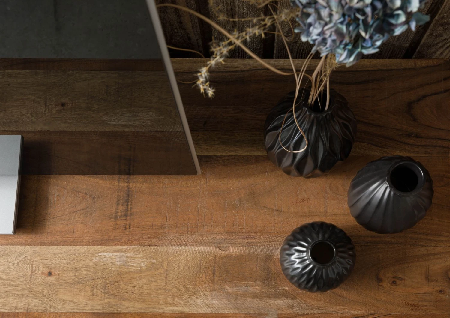 Uno stupefacente triplice talento! Questo mobile TV è suddivisibile in tre sezioni. A sinistra, sobrie maniglie in metallo ornano le due ante. I frontali in legno di acacia laccato colpiscono per l’elaborata lavorazione. I colpi di pialla visibili sul mobile conferiscono una nota di artigianalità.