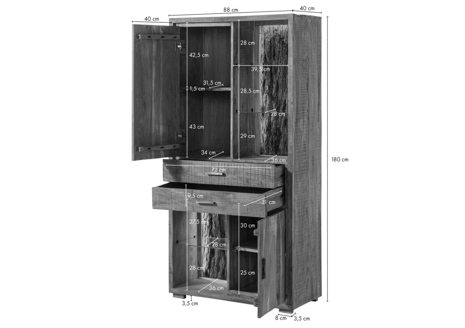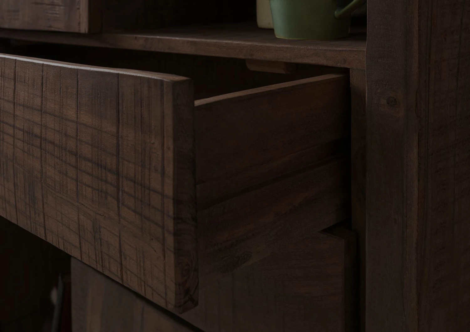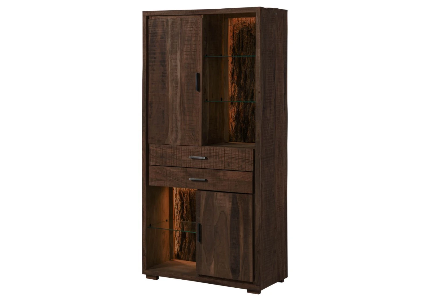 I contropannelli interno delle scaffalature aperte svelano un autentico richiamo visivo: la vera corteccia d’albero, abbracciata dalle venature del legno massello acacia. Altro elemento spicco sono le luci LED integrate, che esaltano con delicatezza solchi e rilievi della corteccia. La calda luce crea un’atmosfera piacevole adatta a qualsiasi contesto abitativo.