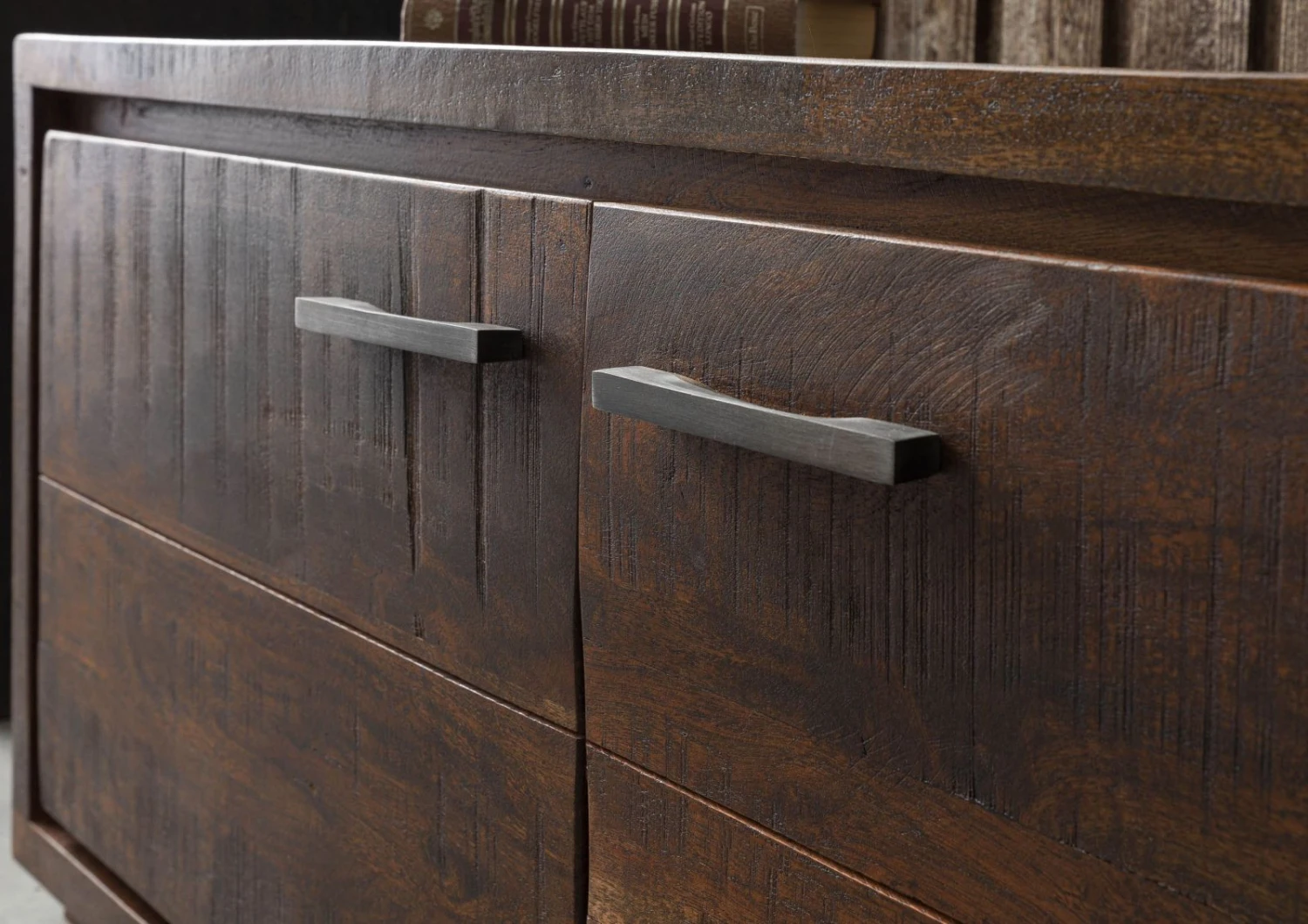 Questo mobile porta TV basso della collezione BARK colpisce per le forme decise e il carattere rustico. Realizzato in legno di acacia di alta qualità con venature tipiche e finitura a pialla, aggiunge un tocco di natura ed eleganza a qualsiasi salotto. La doppia anta dà accesso a un generoso vano dove riporre oggetti, mentre tre cassetti e una pratica scaffalatura soddisfano ogni requisito funzionale.