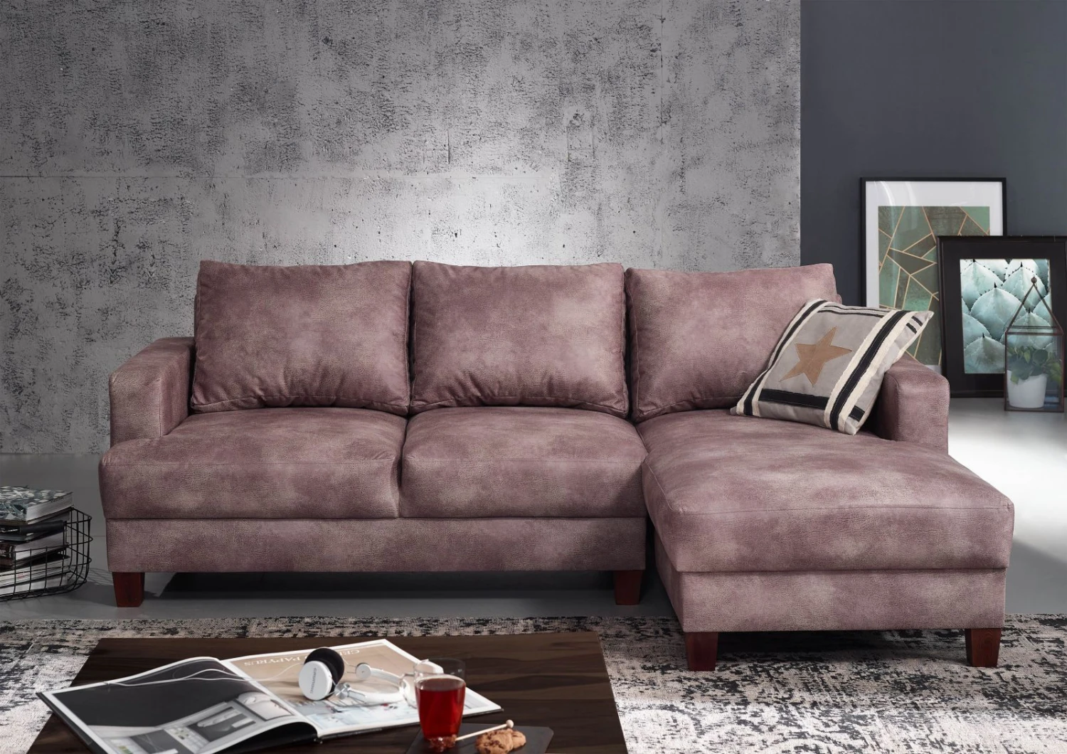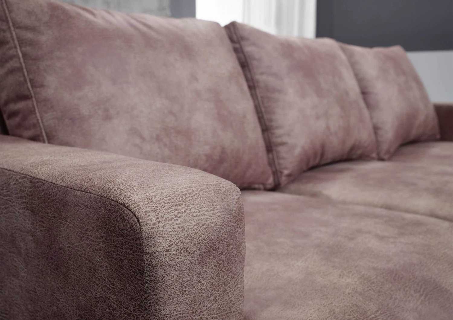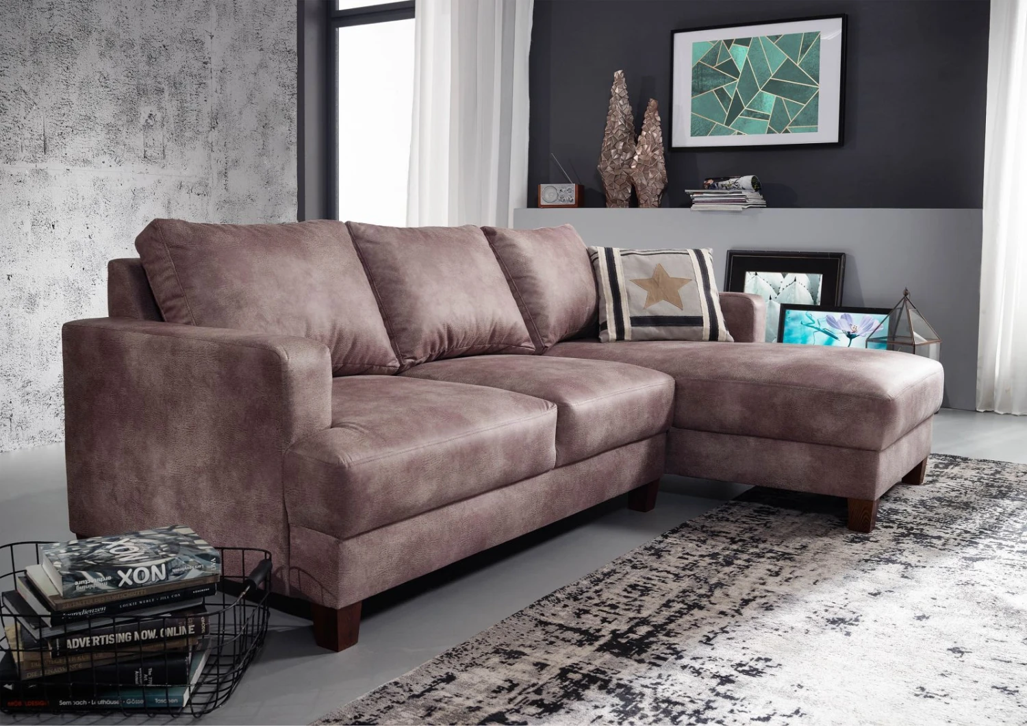 Dimensioni: 210×146 cm Altezza con cuscini: 85 cm Altezza senza cuscini: 71 cm Profondità: circa 88 cm Altezza seduta: circa 41 cm Profondità seduta con cuscini: 55 cm Rivestimento: 100% poliestere Imbottitura: schiuma su molle greche Telaio: legno Piedini: legno marrone inclusi 3 cuscini per lo schienale Cuscini chiari, coperta e decorazioni varie non inclusi. Se desiderate un divano angolare che colpisca per il suo aspetto armonioso e pieno di carattere, il divano CABO color argento fa al caso vostro! Questo splendido divano non solo colpisce per la sua generosa e confortevole imbottitura, ma anche per il suo inconfondibile look rétro. Il particolare look antico è dovuto all’insolito rivestimento, che ricorda la pelle con il suo effetto usurato. Tuttavia, la superficie non è realizzata in pelle, bensì in poliestere che è stato lavorato per assomigliare al materiale di origine animale. Lasciatevi ispirare da questo originale mobile e dai cuscini dello schienale inclusi!