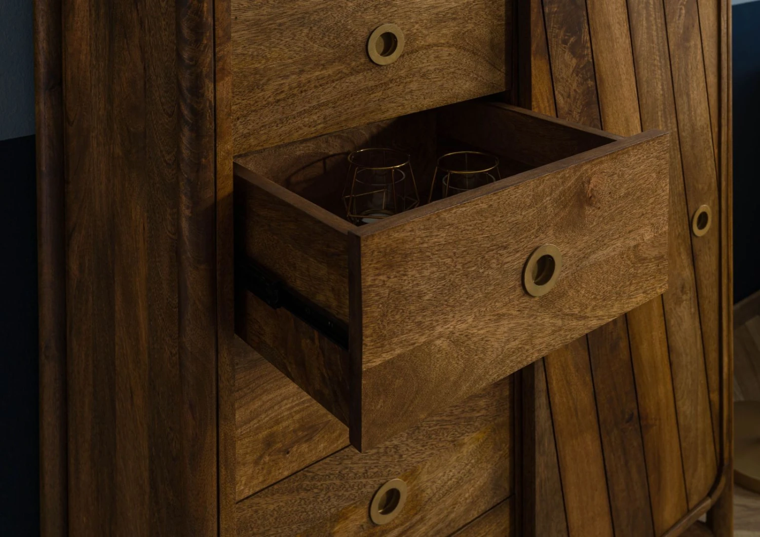 Dazu bietet die braune Kommode viel Platz, um Gegenstände aller Art stilvoll zu verstauen – dank der fünf Schubladen und drei Ablagen. Die Schiebetür sorgt für ein weiteres Highlight: Mit schrägen Fräslinien versehen, erstrahlt die Front in einer interessanten Parkett-Optik. Die schmalen Beine des Möbels ergänzen das Linienspiel und verleihen der Kommode ein Gefühl von Leichtigkeit.