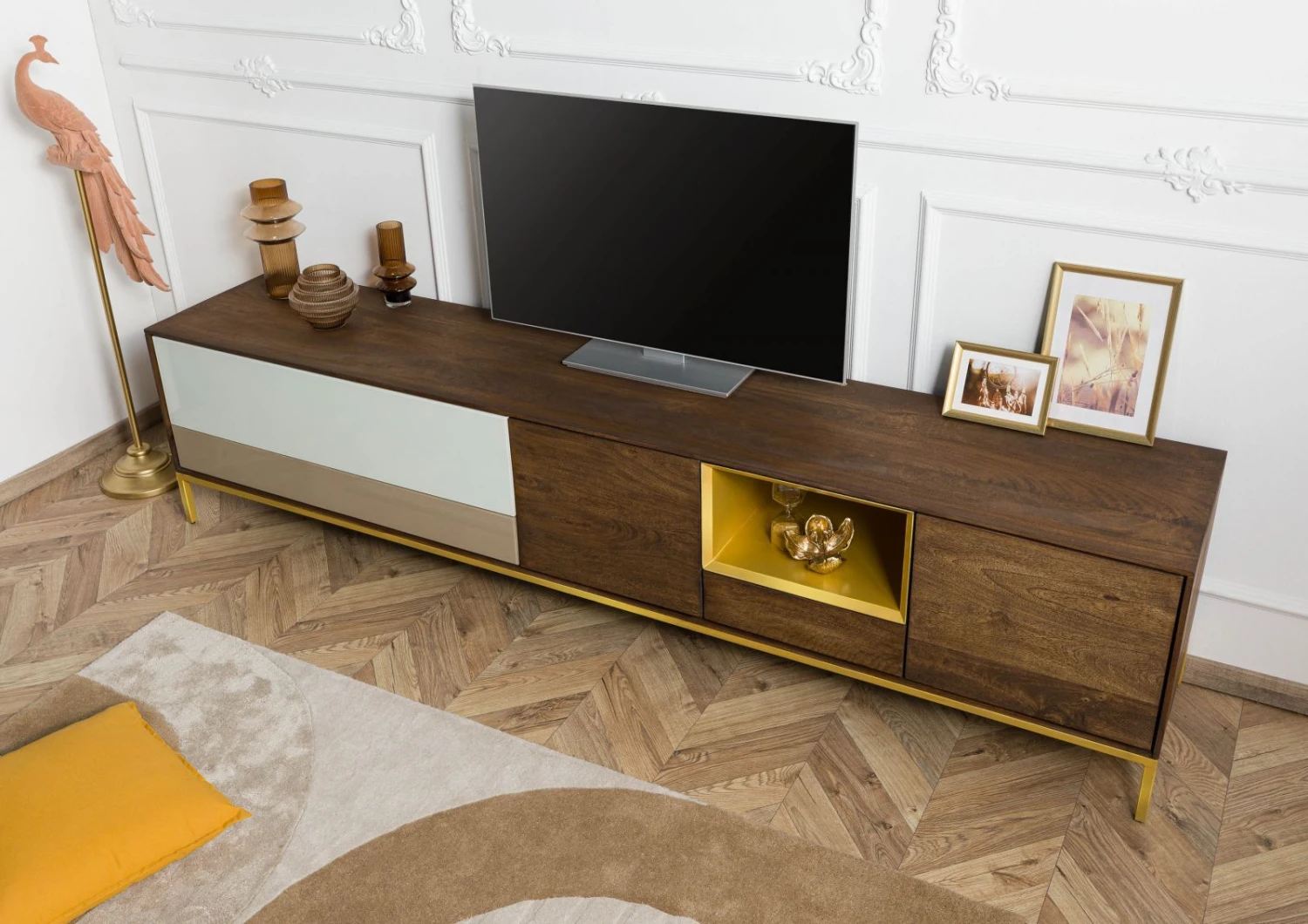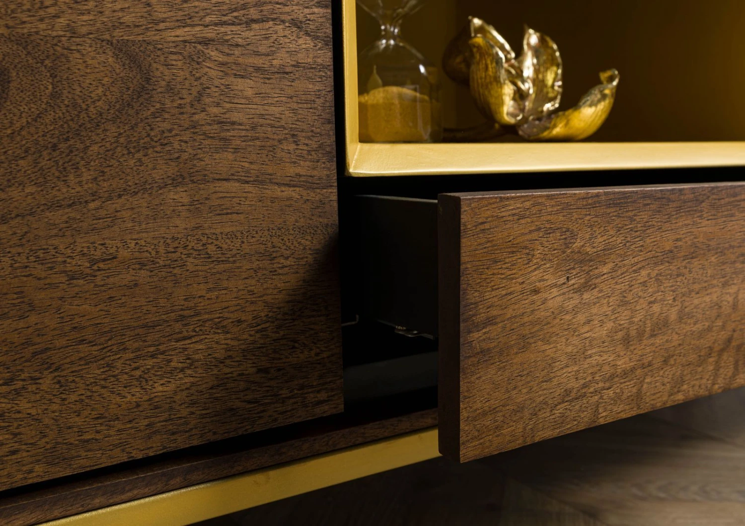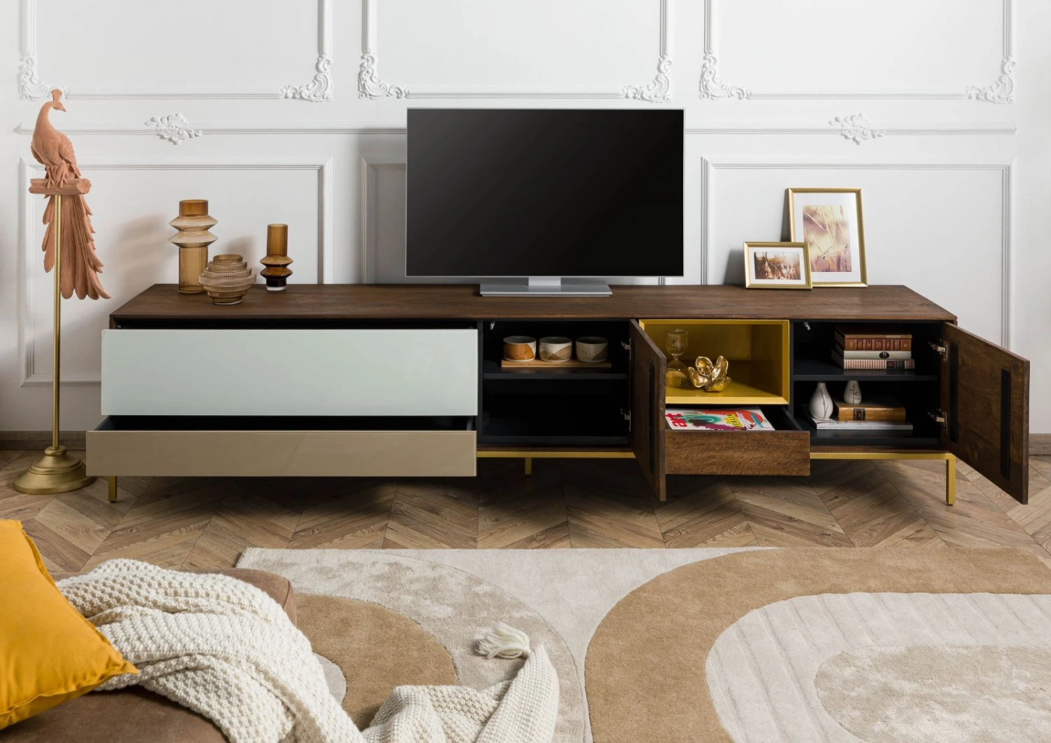 Il punto focale di qualsiasi spazio living: questo mobile TV di design in legno massiccio di mango marrone scuro è un capolavoro di grande effetto per il vostro salotto. L’abbinamento studiato dei materiali interessa l’intero mobile: i piedini e il vano aperto in metallo dorato si combinano con le vivaci venature del legno e i frontali dei cassetti chiari per creare un risultato ricco di fascino.