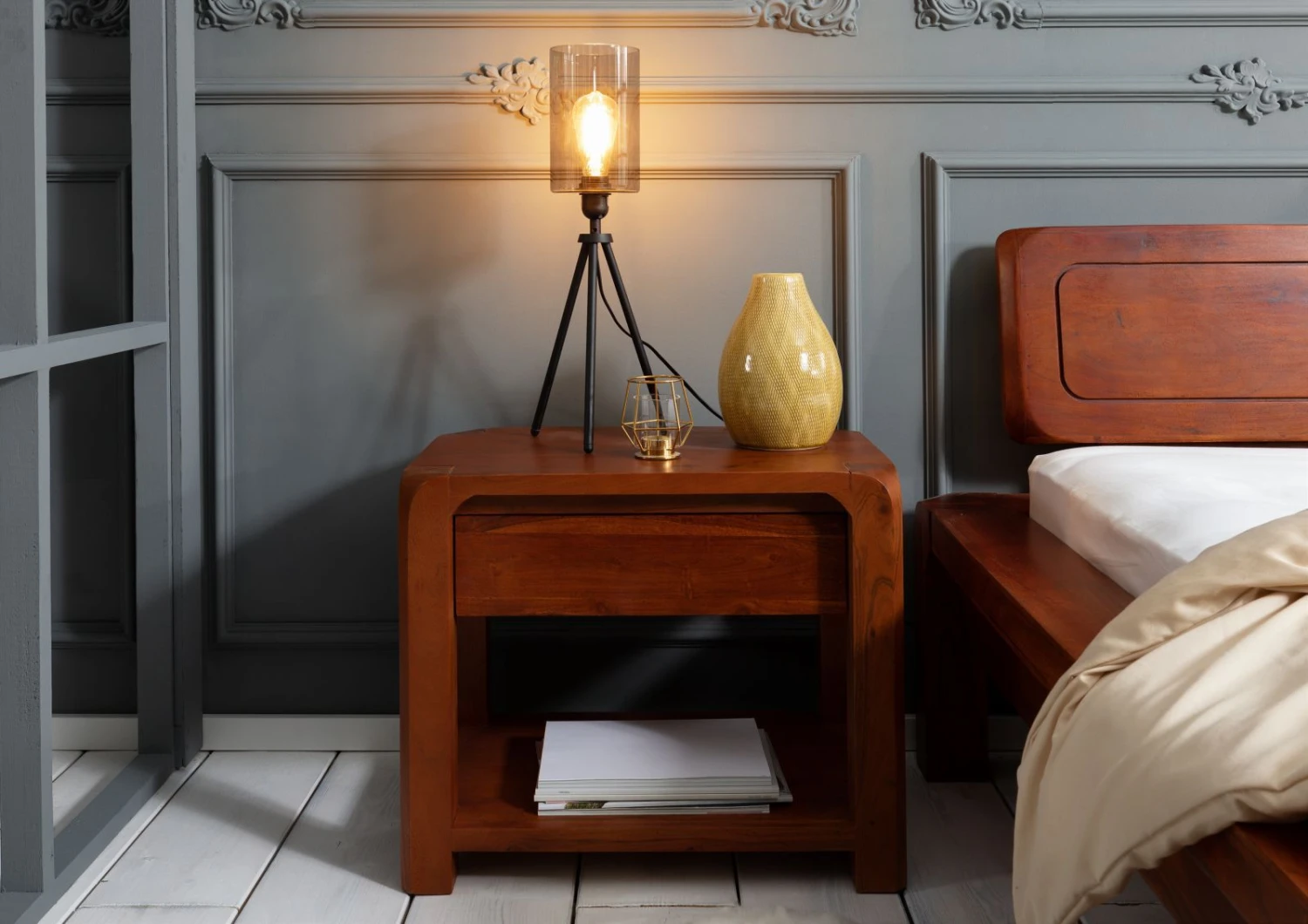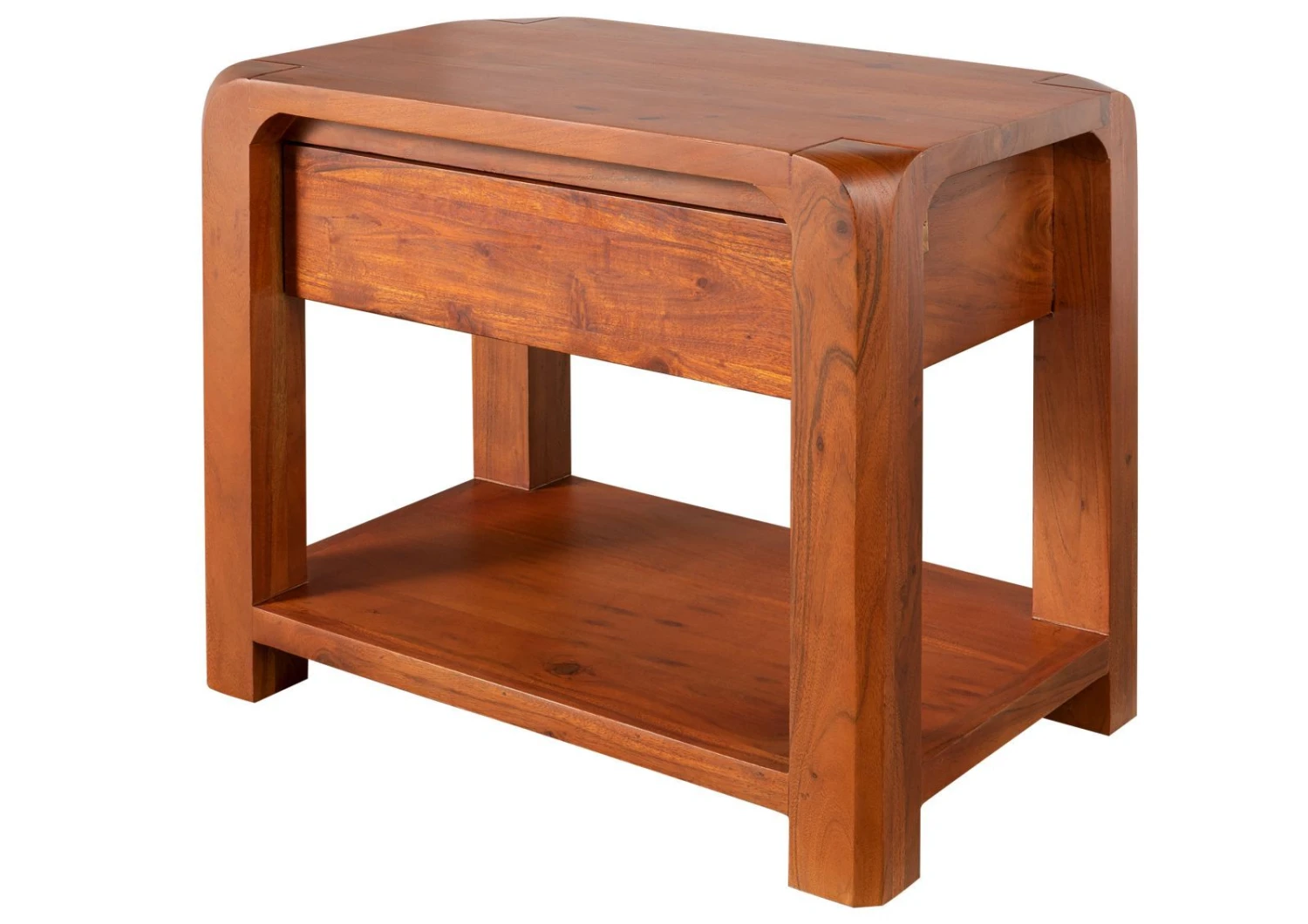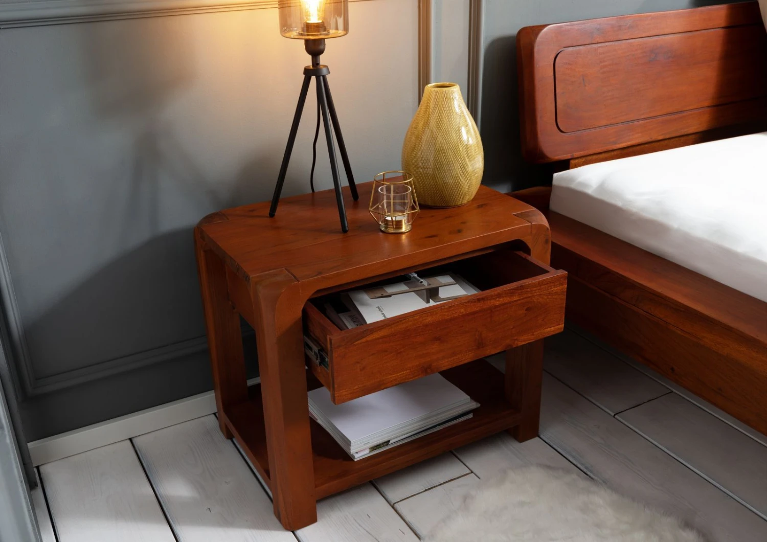 Bastano pochi dettagli per creare unatmosfera intima e accogliente nella zona notte. Lesempio lampante è questo stupendo comodino in legno massello di acacia, dal look semplice, moderno, ma di grande personalità. La superficie laccata sottolinea ogni venatura, discromia e imperfezione del materiale. La tinta cromatica dominante è un magnifico color miele, decorato però da sfumature tendenti al nocciola e miele intensi. Nella sezione superiore, sotto il ripiano principale, è presente un pratico cassetto dotato di meccanismo puch-to open. Più in basso è stato ricavato un secondo ripiano porta oggetti. Il comodino in legno massello risulta efficace sia singolarmente che abbinato con un gemello ai lati del letto matrimoniale.