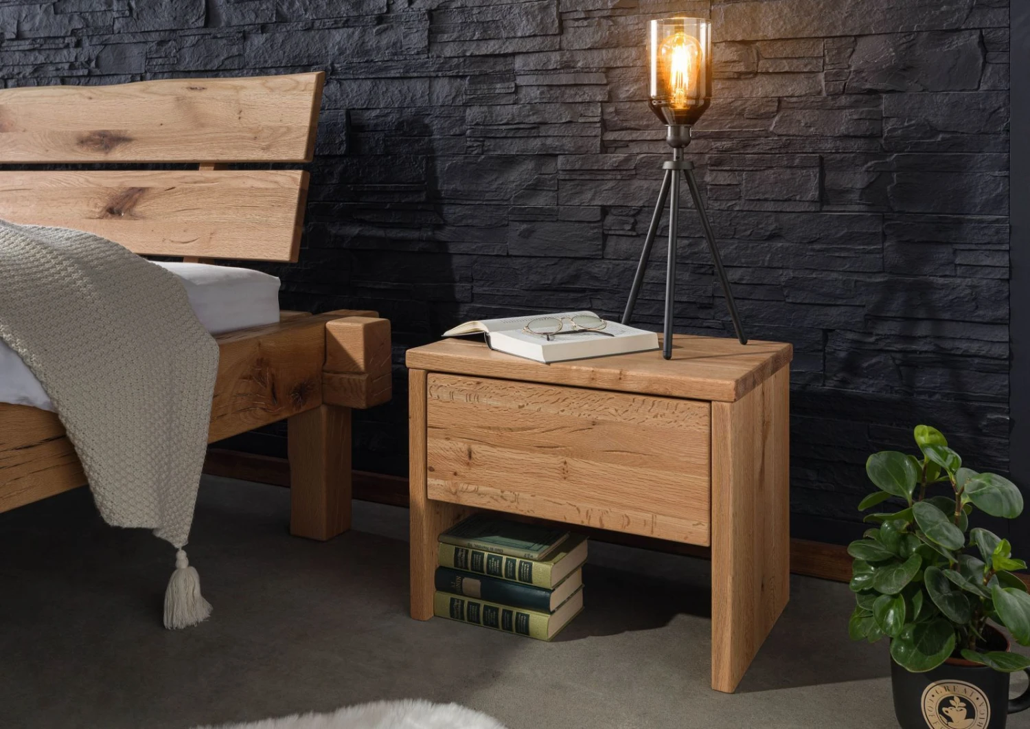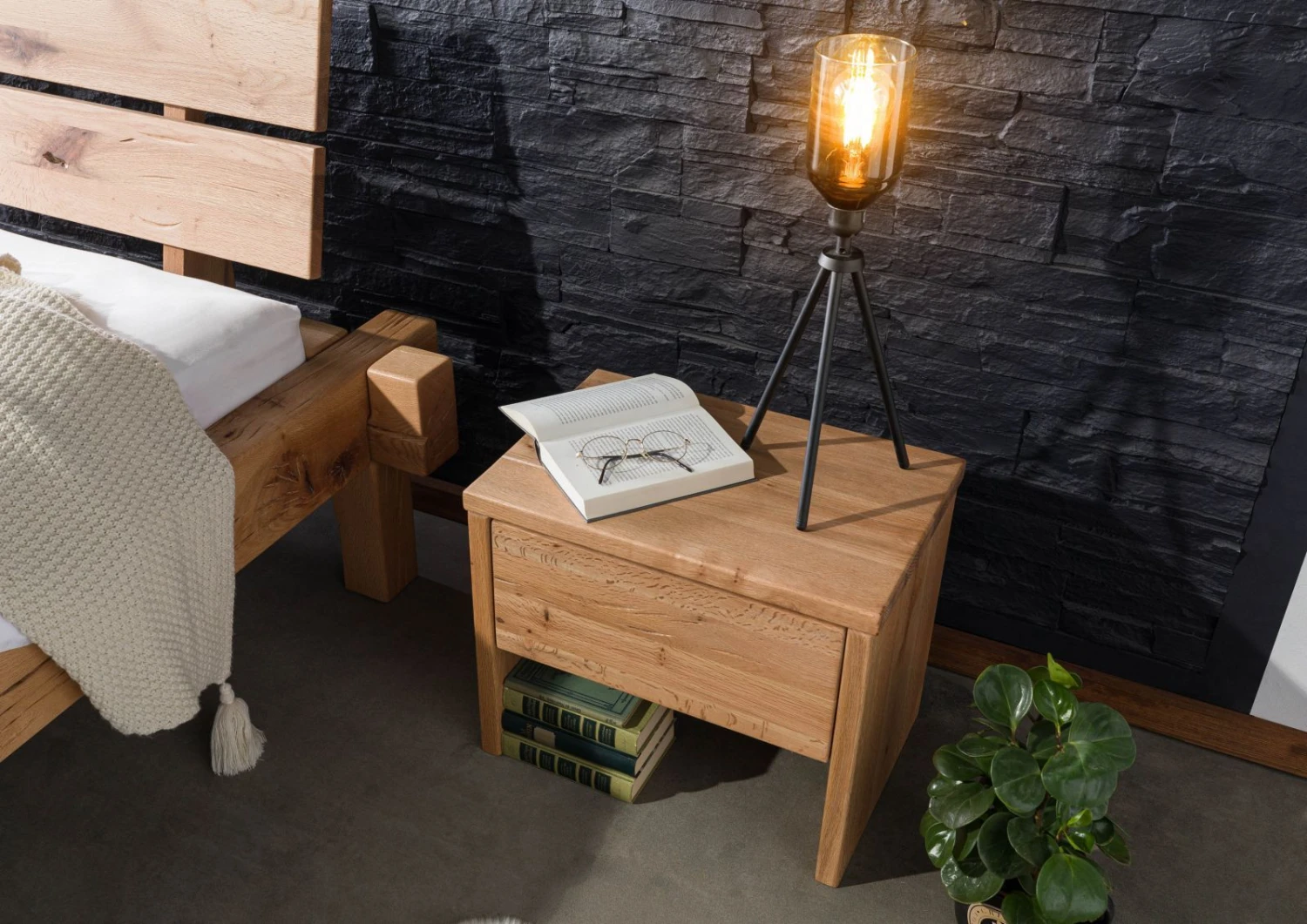 Il design funzionale esalta la ricercata composizione artigianale del mobile, reso unico dalle crepe e dai nodi naturalmente presenti nel legno. Il risultato è un oggetto sfaccettato, capace di dare risalto al carattere autentico e irripetibile di ogni albero. La pregiata finitura superficiale con olio non solo protegge dagli agenti esterni, ma consente anche al legno di respirare. Oltre che fare una gran bella figura, questo comodino contribuisce quindi anche a creare un clima sano.