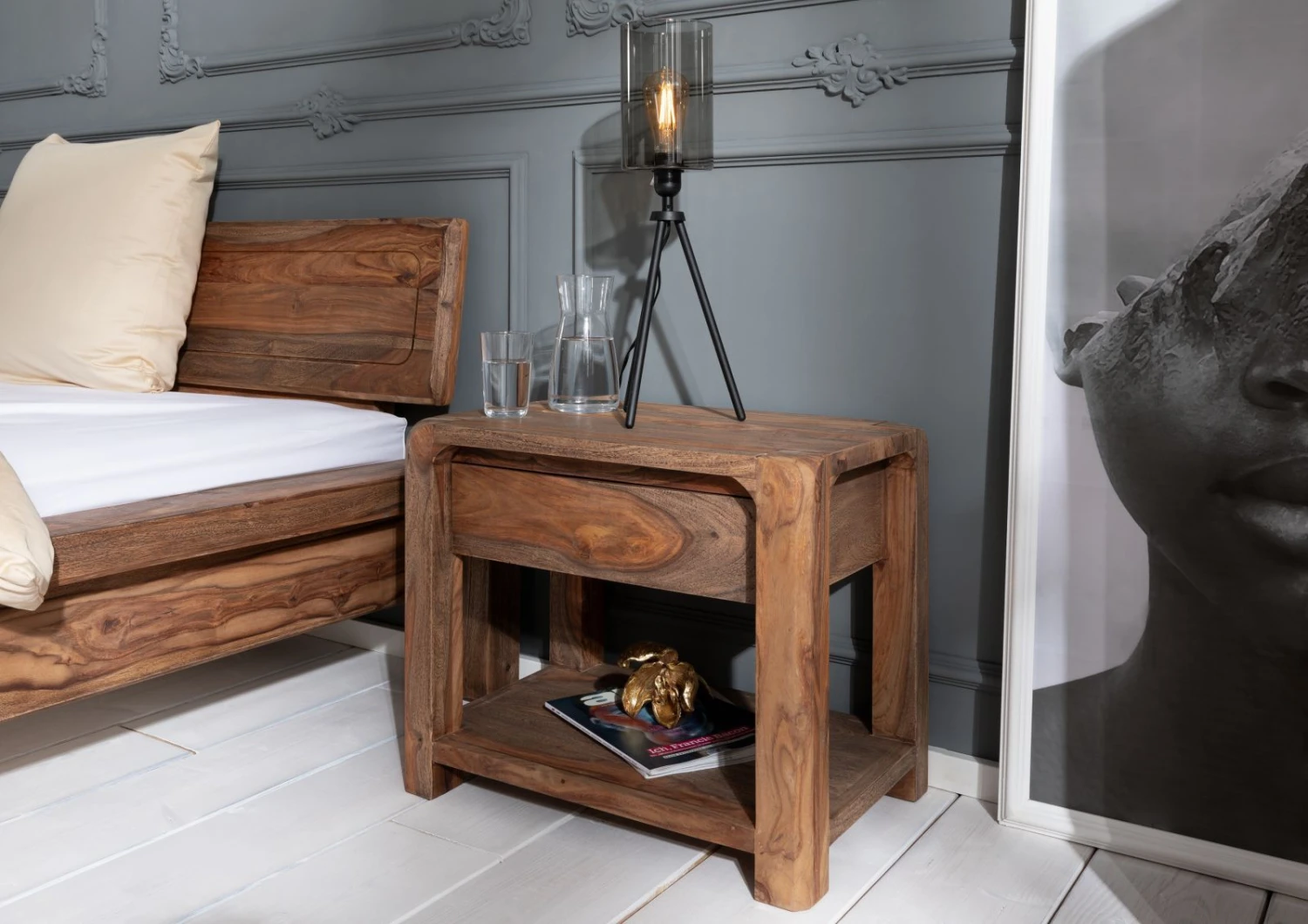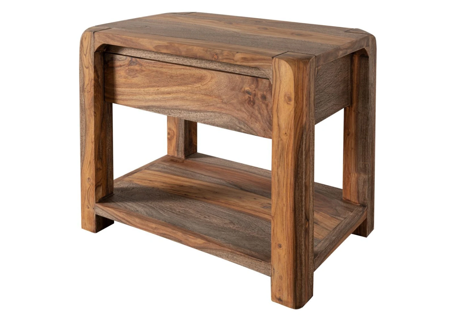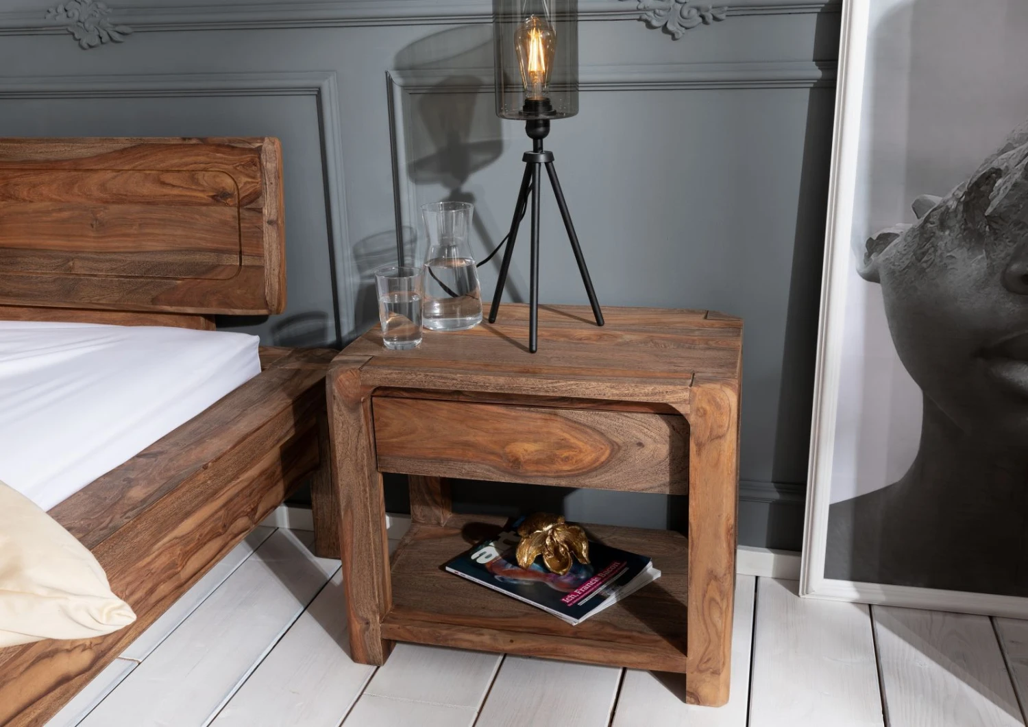 Bastano pochi dettagli per creare unatmosfera intima e accogliente nella zona notte. Lesempio lampante è questo stupendo comodino in legno massello di palissandro (Sheesham), dal look semplice, moderno, ma di grande personalità. La superficie oliata sottolinea ogni venatura, discromia e imperfezione del materiale. La tinta cromatica dominante è un magnifico grigio, decorato però da sfumature nocciola intenso. Nella sezione superiore, sotto il ripiano principale, è presente un pratico cassetto dotato di meccanismo puch-to open. Più in basso è stato ricavato un secondo ripiano porta oggetti. Il comodino in legno massello risulta efficace sia singolarmente che abbinato con un gemello ai lati del letto matrimoniale.