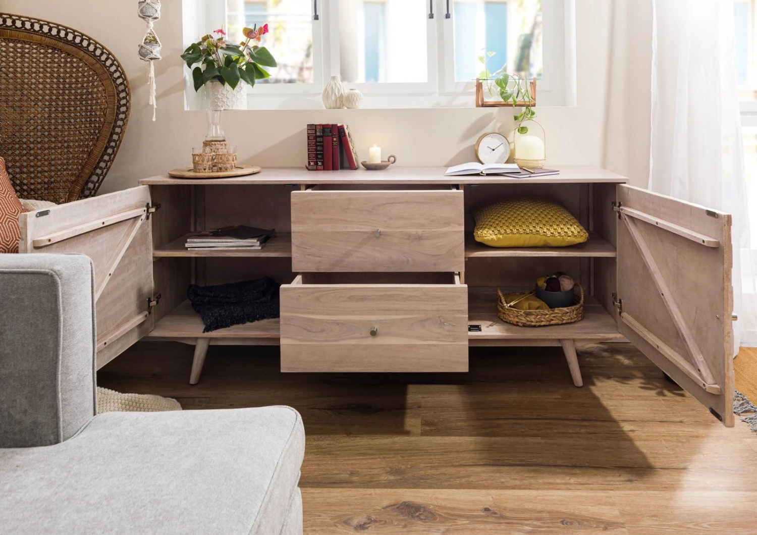 Credenza in legno massello di acacia colore bianco e superficie verniciata che esalta le autentiche discromie del materiale. Il mobile si presenta con un corpo imponente e monolitico, sorretto da quattro piccole ma robuste gambe a compasso. La sezione centrale, nella parte superiore e inferiore, ospita due cassettoni a prolunga telescopica con maniglia in metallo satinato. Ai lati, due ante a battente rivelano altrettanti vani di contenimento suddivisi da un ripiano centrale. Anche gli sportelli hanno maniglie in metallo, mentre le aperture sono concepite con meccanismo a scodellino (o a tazza). Le dimensioni importanti di questa credenza in legno massello in stile vintage esigono un ambiente spazioso e luminoso, idealmente il salone o la zona living.