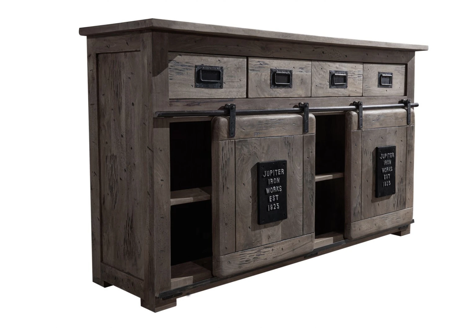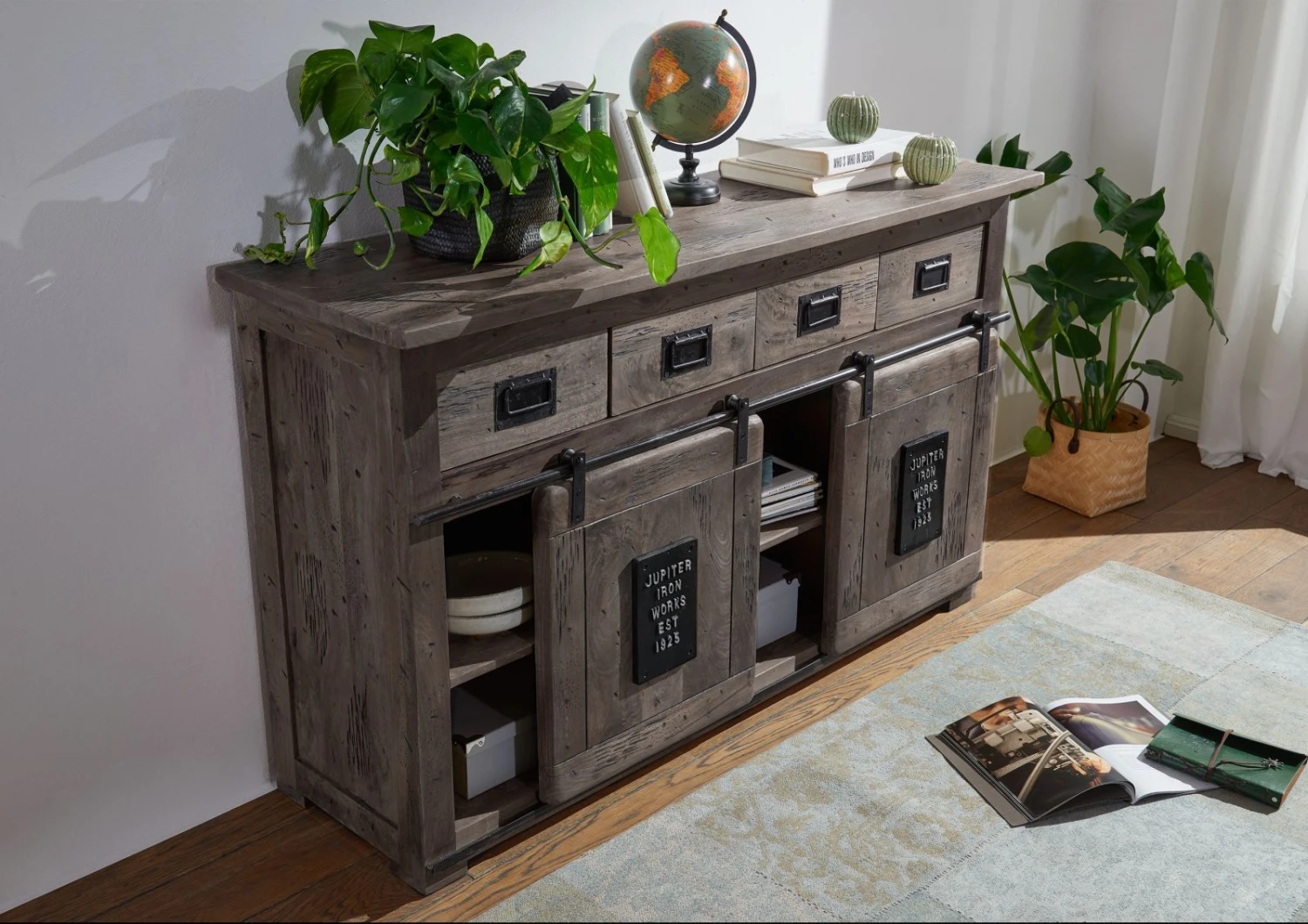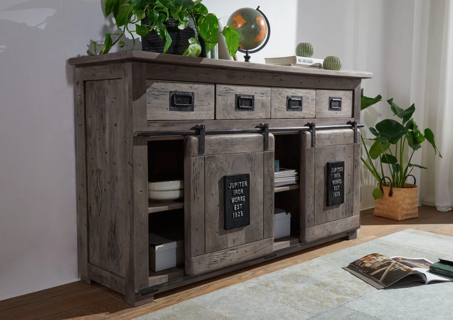 Credenza in legno massello di mango dal look rustico ad effetto usurato che si ispira allo stile industriale. Il colore grigio è impreziosito dal trattamento di verniciatura e dalle autentiche discromie del materiale naturale. Nella sezione inferiore si evidenziano vani di contenimento su due piani, separati da un mensola orizzontale. Sul lato destro è presente una colonna di tre cassetti con maniglie in ferro anticato. Altri quattro sono collocati su una stessa fila nella sezione superiore, poco sotto la modanatura del ripiano principale. Infine ad arricchire la facciata di questa credenza in legno massello sono stati aggiunti pannelli scorrevoli ancorati a binari metallici. Spostando gli sportelli si accede agli spazi interni. Si può però anche modificarne la posizione per variare lassetto estetico e funzionale del mobile.