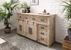 Credenza in legno massello di mango dal look rustico ad effetto usurato che si ispira allo stile industriale. Il colore bianco velato è impreziosito dal trattamento di verniciatura e dalle autentiche discromie del materiale naturale in evidenza. Nella sezione inferiore si evidenziano vani di contenimento su due piani, separati da un mensola orizzontale. Sul lato destro è presente una colonna di tre cassetti con maniglie in ferro anticato. Altri quattro sono collocati su una stessa fila nella sezione superiore, poco sotto la modanatura del ripiano principale. Infine ad arricchire la facciata di questa credenza in legno massello sono stati aggiunti pannelli scorrevoli ancorati a binari metallici. Spostando gli sportelli si accede agli spazi interni. Si può però anche modificarne la posizione per variare lassetto estetico e funzionale del mobile. Le parti metalliche sono verniciate in color grigio pastello chiaro.