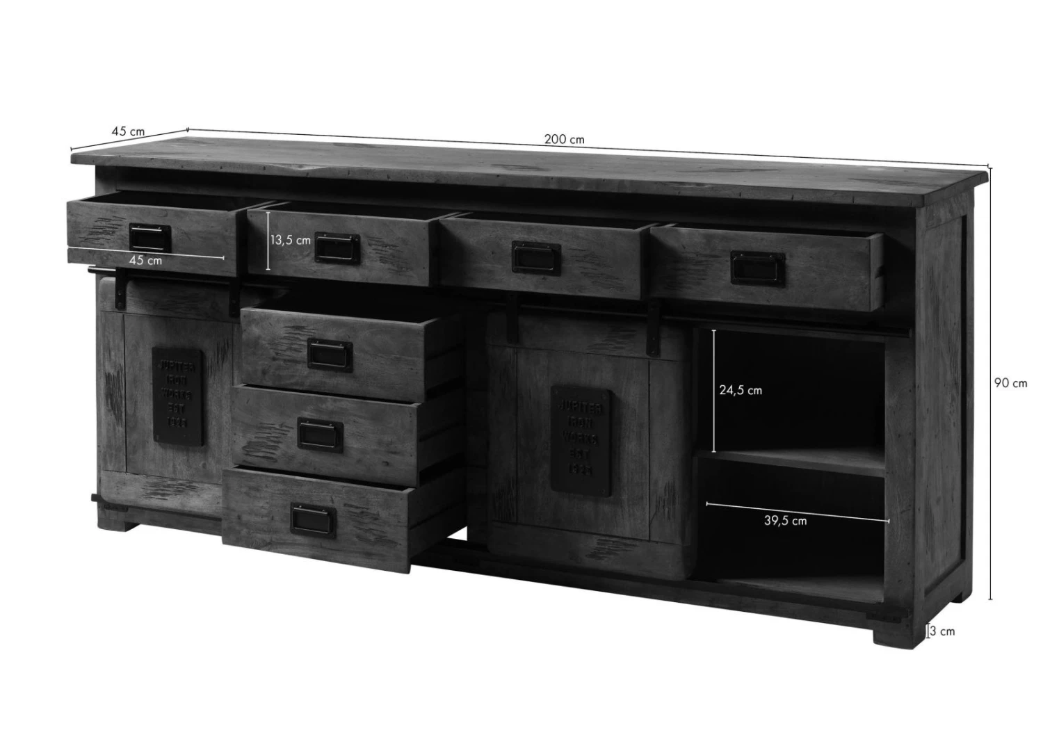 Credenza in legno massello di mango provvista di ben 10 cassetti, di cui 4 su ununica fila nella sezione superiore e i restanti 6 nella parte centrale, disposti su due colonne. Tutti sono provvisti di maniglie in metallo color grigio chiaro. Vi sono inoltre altri vani di contenimento, ricavati sui due lati e nascosti dietro sportelli scorrevoli. I tipici pannelli ornamentali della collezione Railway, si muovono grazie a binari metallici che percorrono lintera lunghezza del mobile. Modificandone la posizione si può cambiare la configurazione della credenza in legno massello. Una parola va spesa inoltre relativamente allo stupendo colore bianco velato ad effetto vissuto. Le imperfezioni, le tracce dei raggi lamellari e le sfumature cromatiche fanno da naturali elementi decorativi di grande effetto visivo.
