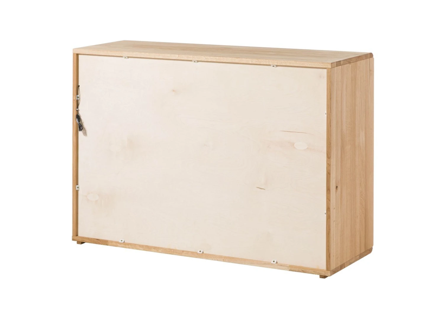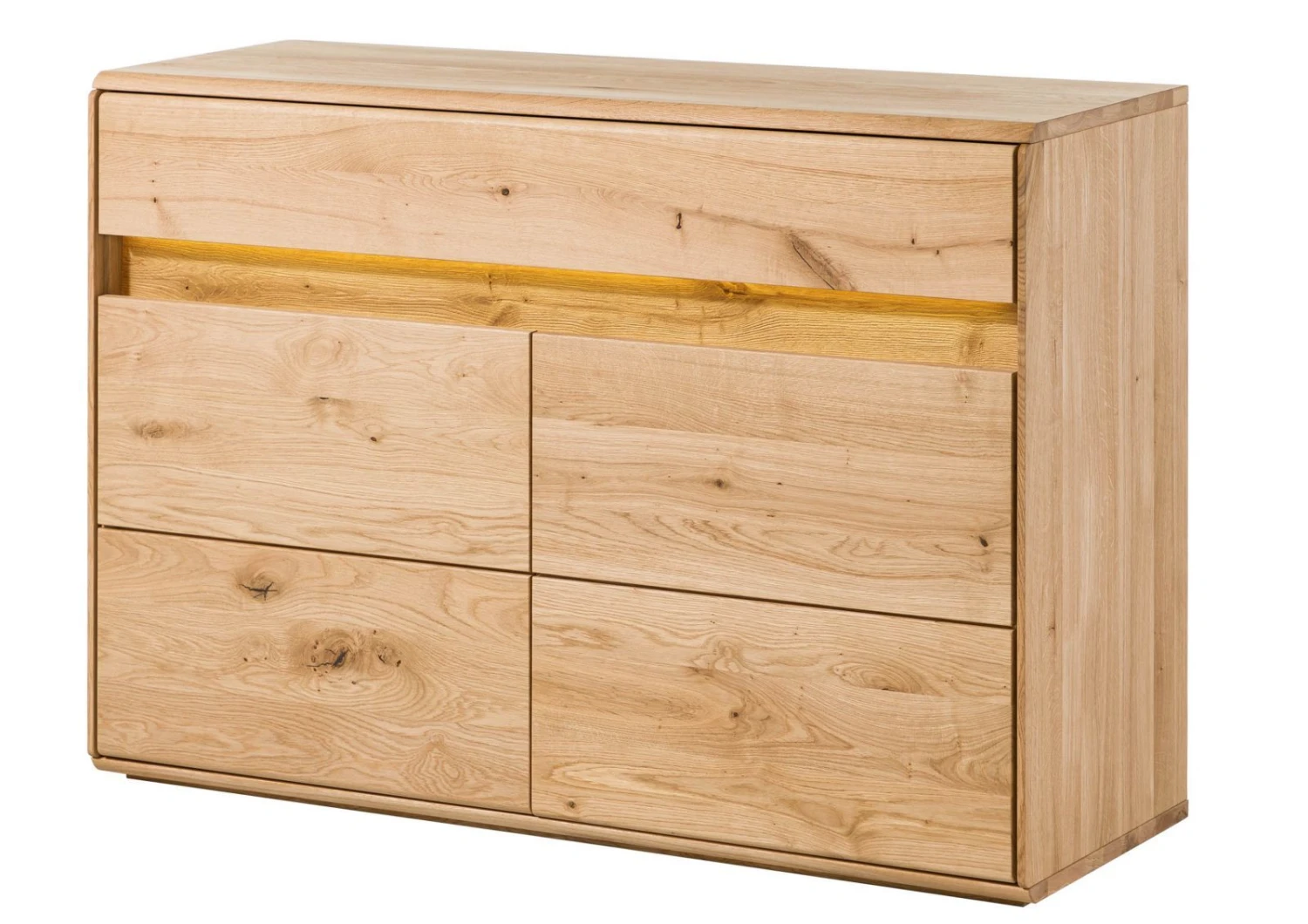 Questa credenza in legno di quercia massiccio cattura sempre l’attenzione di tutti. Il design a pannelli, con le sue linee rette e gli angoli dolcemente arrotondati, crea un look elegante senza bisogno di maniglie. Di conseguenza, lo sguardo si concentra sul carattere rustico del legno di quercia selvatica oliato, che viene valorizzato particolarmente bene nello spazio intermedio illuminato. La modanatura decorativa con superficie spazzolata mette in evidenza le venature uniche del materiale robusto. Si crea così un emozionante contrasto tra forme geometriche e legno organico.