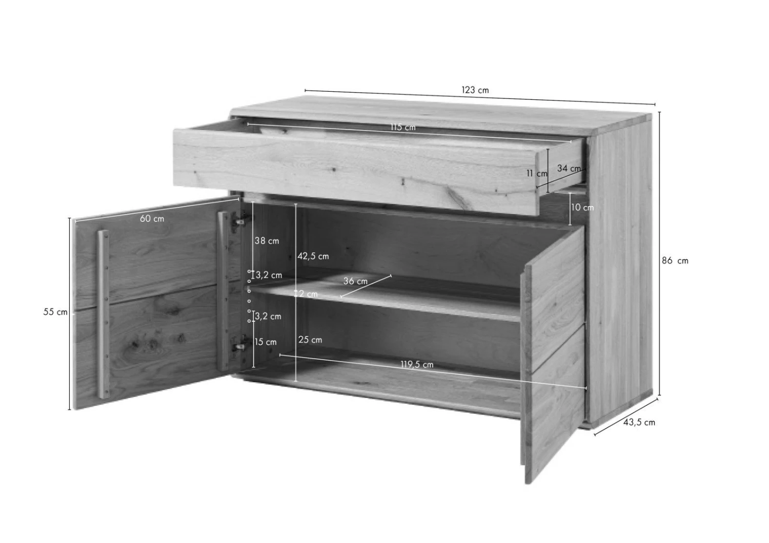 Tuttavia, questa credenza non è solo bella da vedere, ma colpisce anche per il suo design ben studiato. Nel grande cassetto si può riporre un’ampia varietà di utensili. Anche gli scomparti della parte inferiore offrono molto spazio. Le dimensioni di questi ultimi possono essere personalizzate grazie ai ripiani regolabili, in modo da avere spazio sufficiente per tutti i vostri oggetti. Le due ante senza maniglie, che nascondono abilmente il contenuto, si chiudono inoltre in modo particolarmente delicato grazie alla tecnologia Soft Close. Questa credenza non è solo un vero e proprio punto focale dell’arredamento, ma anche molto pratica nell’uso quotidiano.