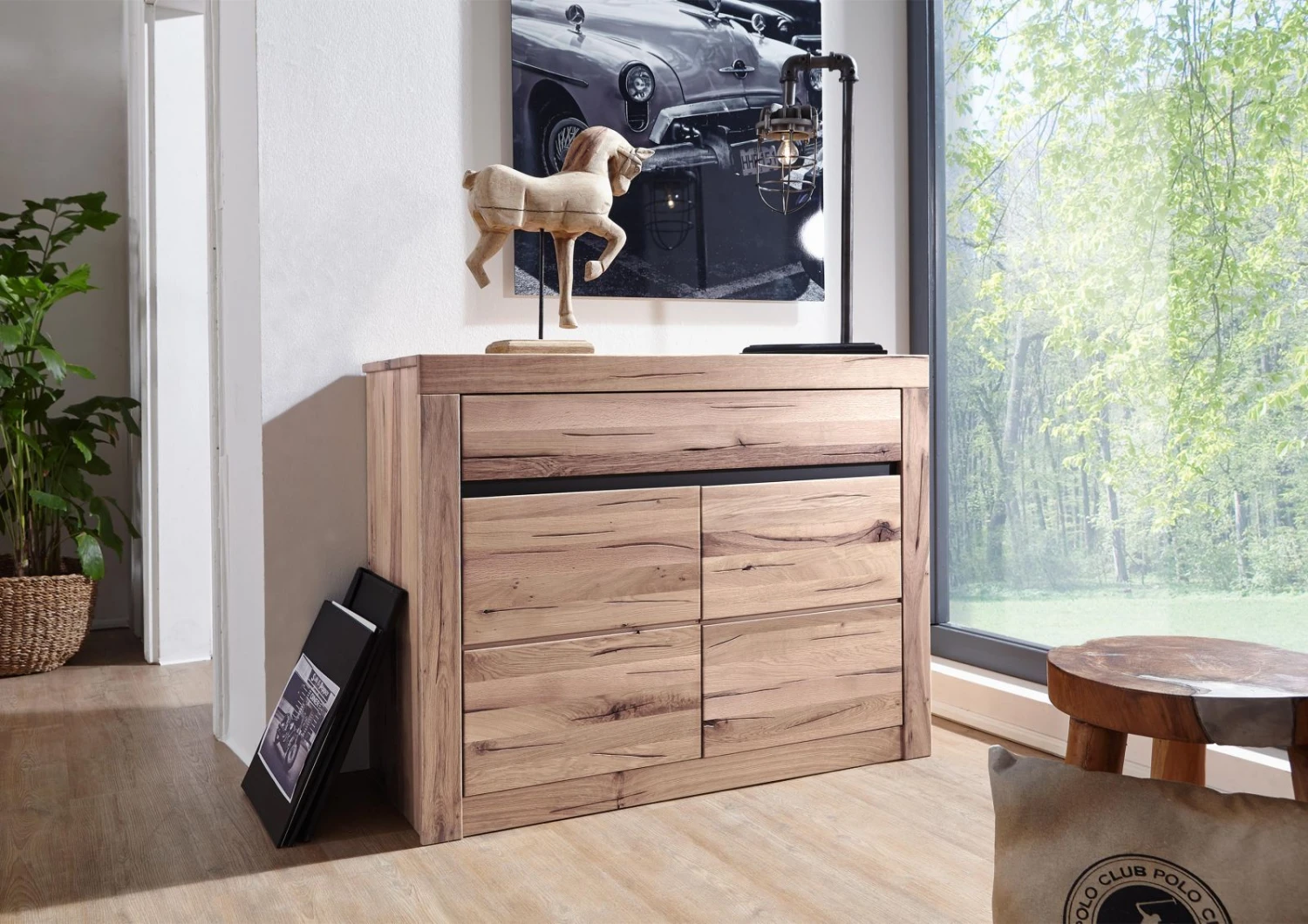 Credenza in legno massello di cerro, superficie con trattamento oliato, colore bianco e sfumature dal legno naturale. Una geometria essenziale e solida per un mobile che rivisita lo stile moderno in chiave rustica. Due sezioni di archiviazione sono organizzate partendo dallalto con un ampio cassettone e sotto con un grande vano a due ante, una mensola per due scomparti di contenimento. Carrelli e cerniere sono provvisti del sistema di scorrimento fluido e silenzioso soft-close, mentre le maniglie sono state sostituite con aperture a gola. La credenza in legno massello ha forme nette ma morbide con il ripiano principale e la base a zoccolo chiuso dello stesso spessore delle travi laterali che fanno da ossatura alla struttura. Altri elementi portanti sono il pannello posteriore e quello di metallo che separa i due vani di alloggio.