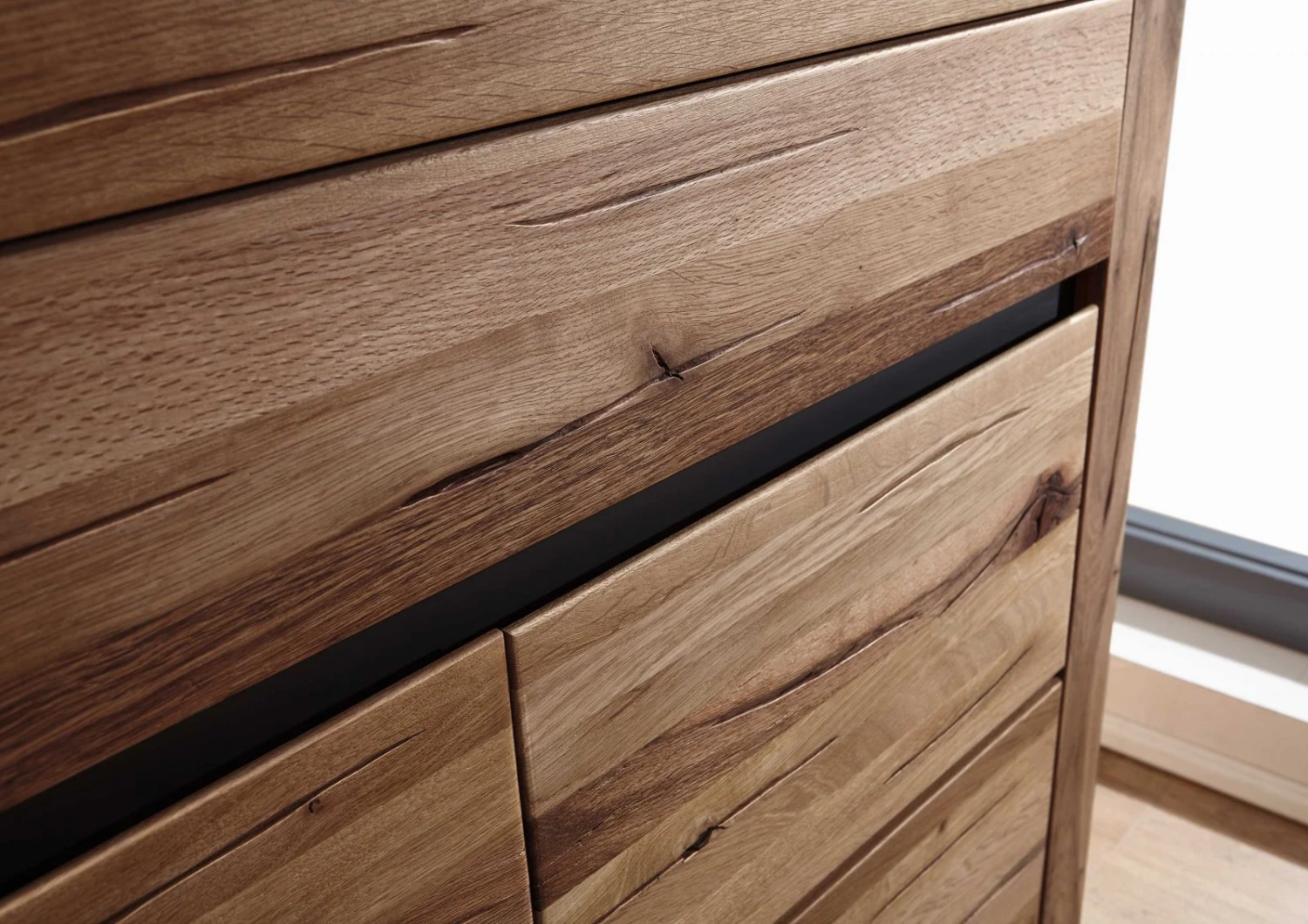 Credenza in legno massello di cerro, superficie con trattamento oliato, color marrone tabacco e sfumature dal chiaro al nero. Una geometria essenziale e solida per un mobile che rivisita lo stile moderno in chiave rustica. Due sezioni di archiviazione sono organizzate partendo dallalto con un ampio cassettone e sotto con un grande vano a due ante, una mensola per due scomparti di contenimento. Carrelli e cerniere sono provvisti del sistema di scorrimento fluido e silenzioso soft-close, mentre le maniglie sono state sostituite con aperture a gola. La credenza in legno massello ha forme nette ma morbide con il ripiano principale e la base a zoccolo chiuso dello stesso spessore delle travi laterali che fanno da ossatura alla struttura. Altri elementi portanti sono il pannello posteriore e quello di metallo che separa i due vani di alloggio.