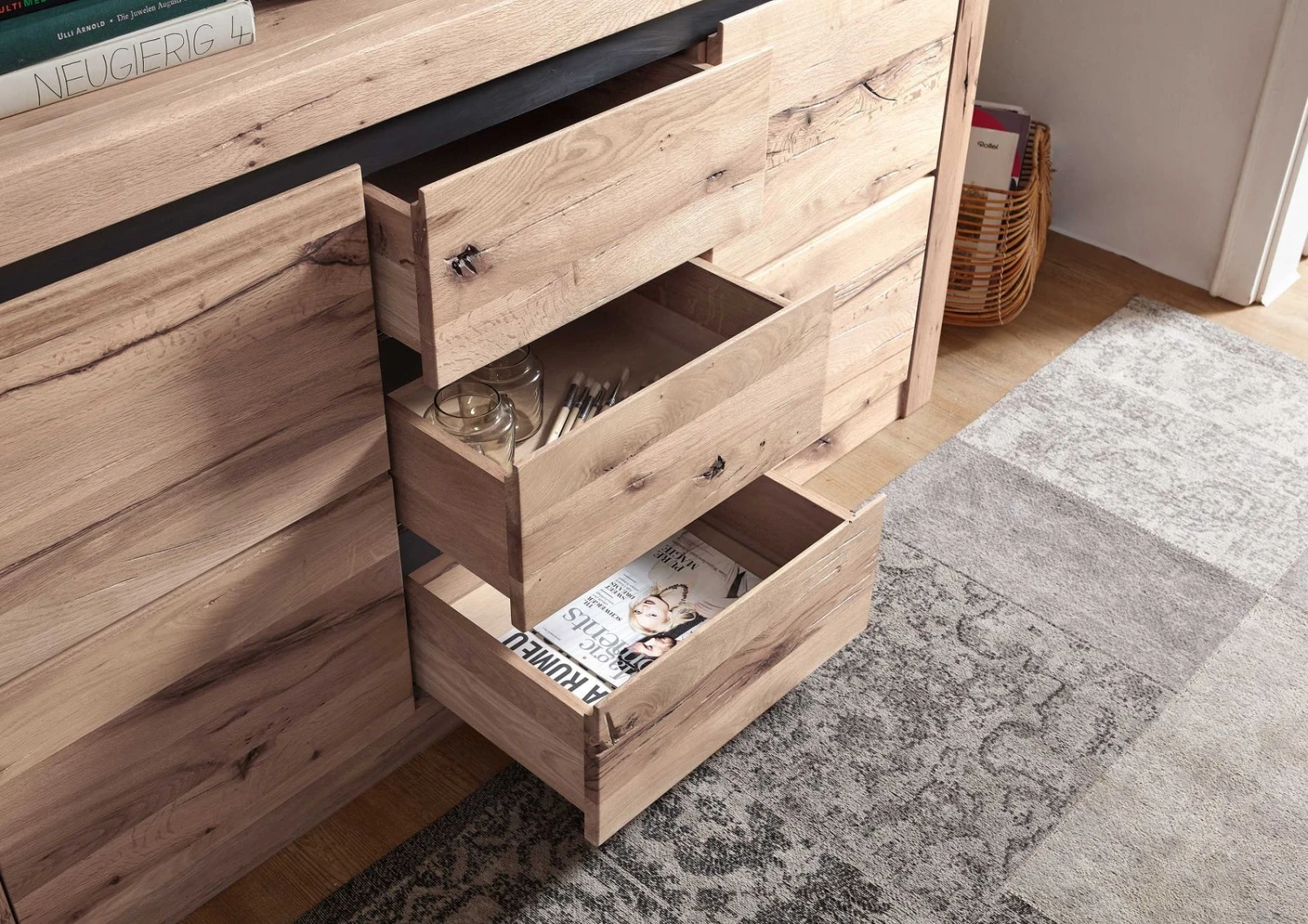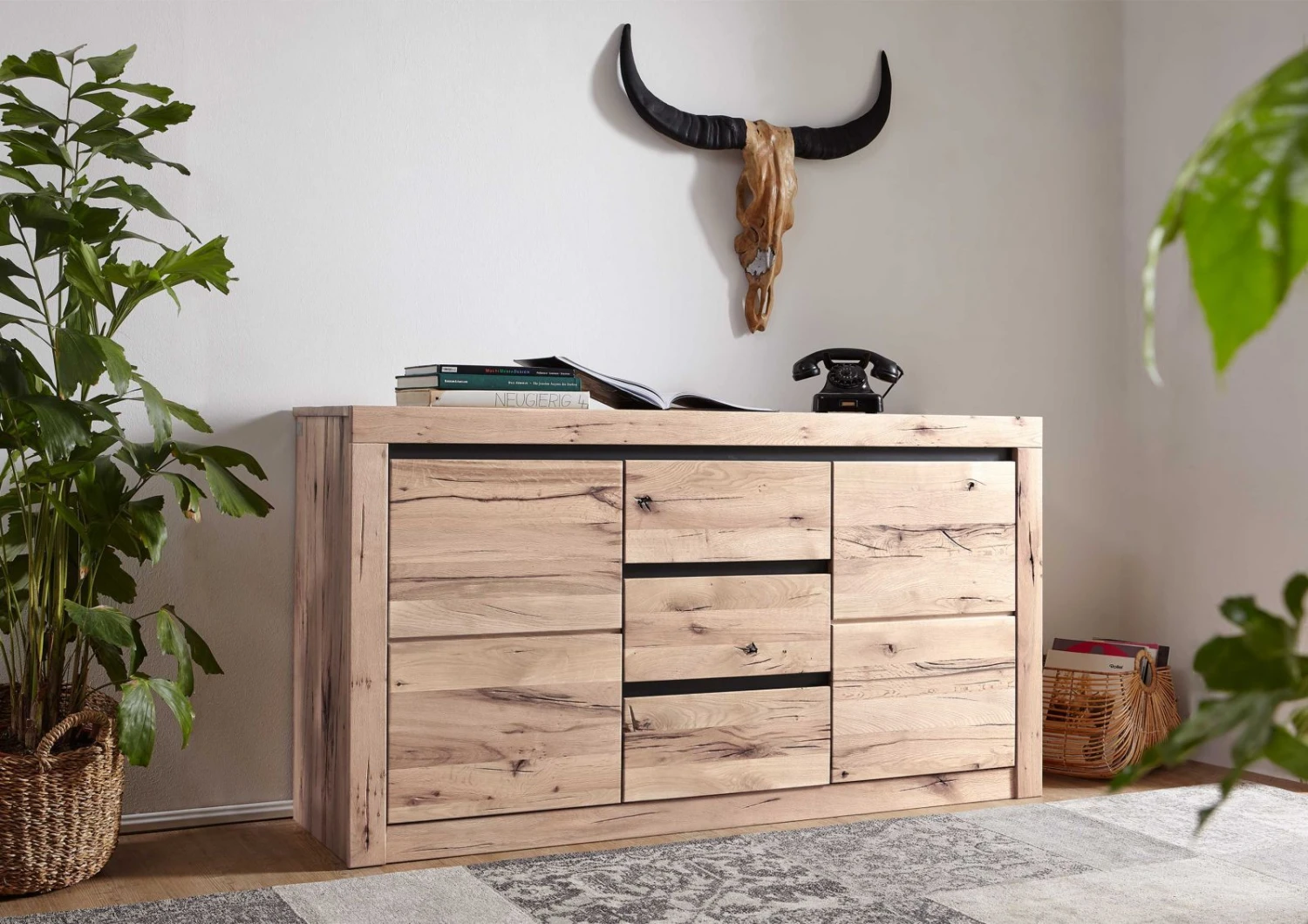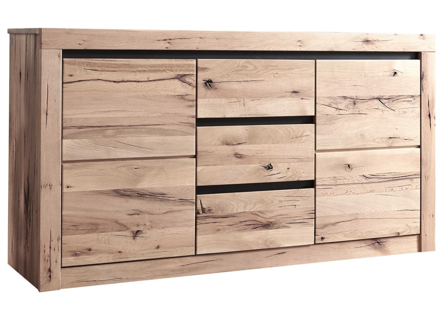 Credenza in legno massello di cerro, mista a quercia spinosa, color bianco, nuance chiare e nere, trattamento oliato, stile moderno ed aspetto rustico. Un mobile per tutte le stagioni, dallestetica fresca ma anche dal design caldo e suggestivo. Tutto merito del particolare gioco cromatico e delle naturali imperfezioni presenti sulla superficie del materiale. Al centro è stata collocata un fila di tre cassetti, mentre ai lati due ante rivelano altrettanti vani con un singolo ripiano che descrive due scoparti di archiviazione. Carrelli e cerniere sono provvisti di sistema silenzioso soft-close per scorrimento fluido e le maniglie sono state sostituite con aperture a gola. Questa credenza in legno massello è tanto semplice quanto bella, da notare gli inserti dei pannelli in metallo che delimitano le componenti, mentre una cornice di spesse travi e assi tengono insieme e descrivono la geometria della struttura.