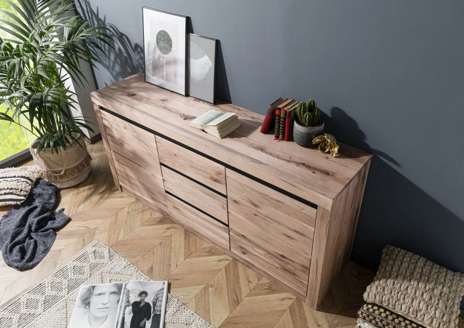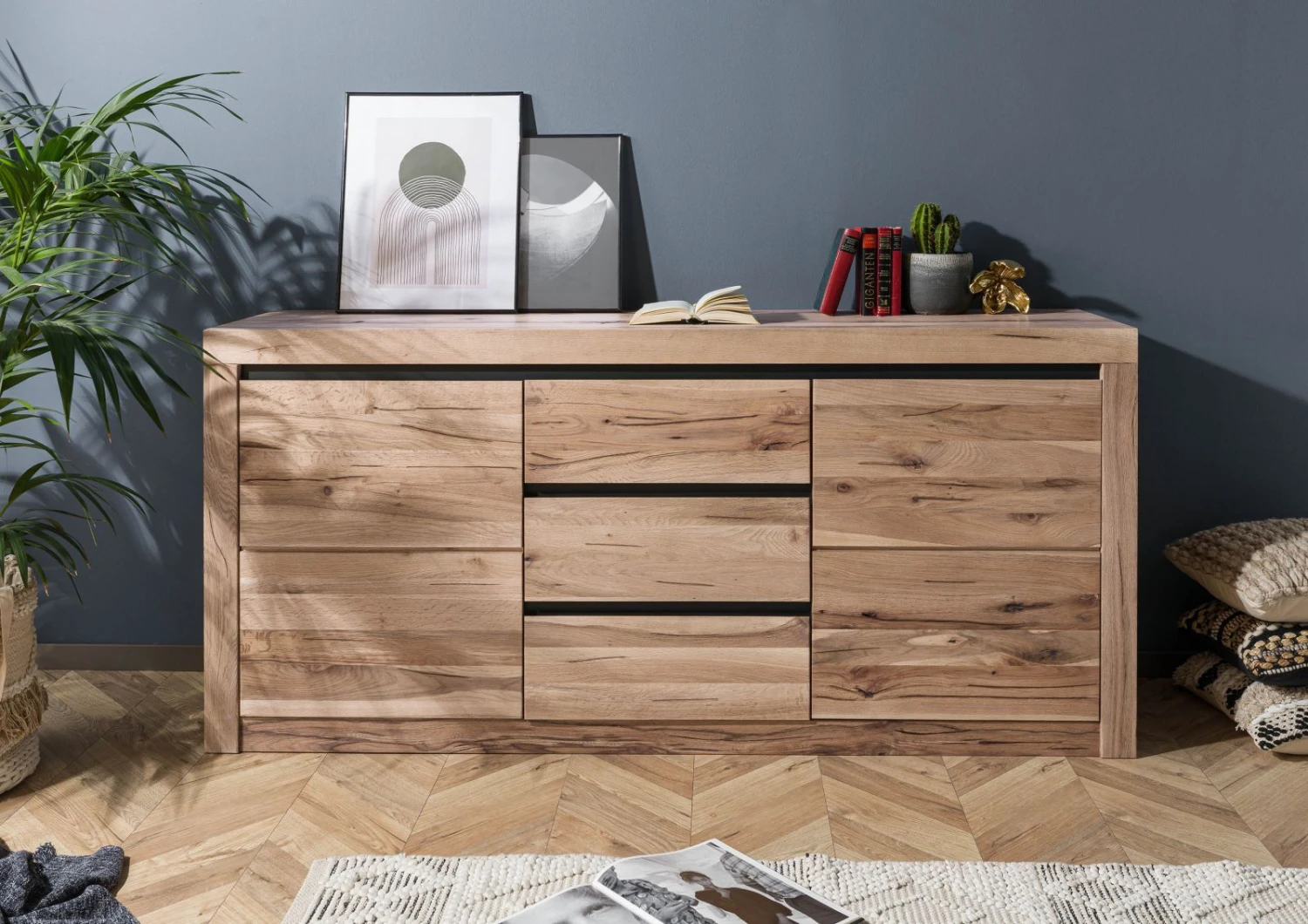 Questo mobile in legno massiccio mette a disposizione anche tanto spazio interno. Decorazioni e stoviglie possono essere facilmente riposte dietro le due ante e nei tre cassetti. La credenza combina anche un funzionamento al passo con i tempi a un design minimalista: la moderna tecnologia Soft Close garantisce una chiusura delicata di ante e cassetti.