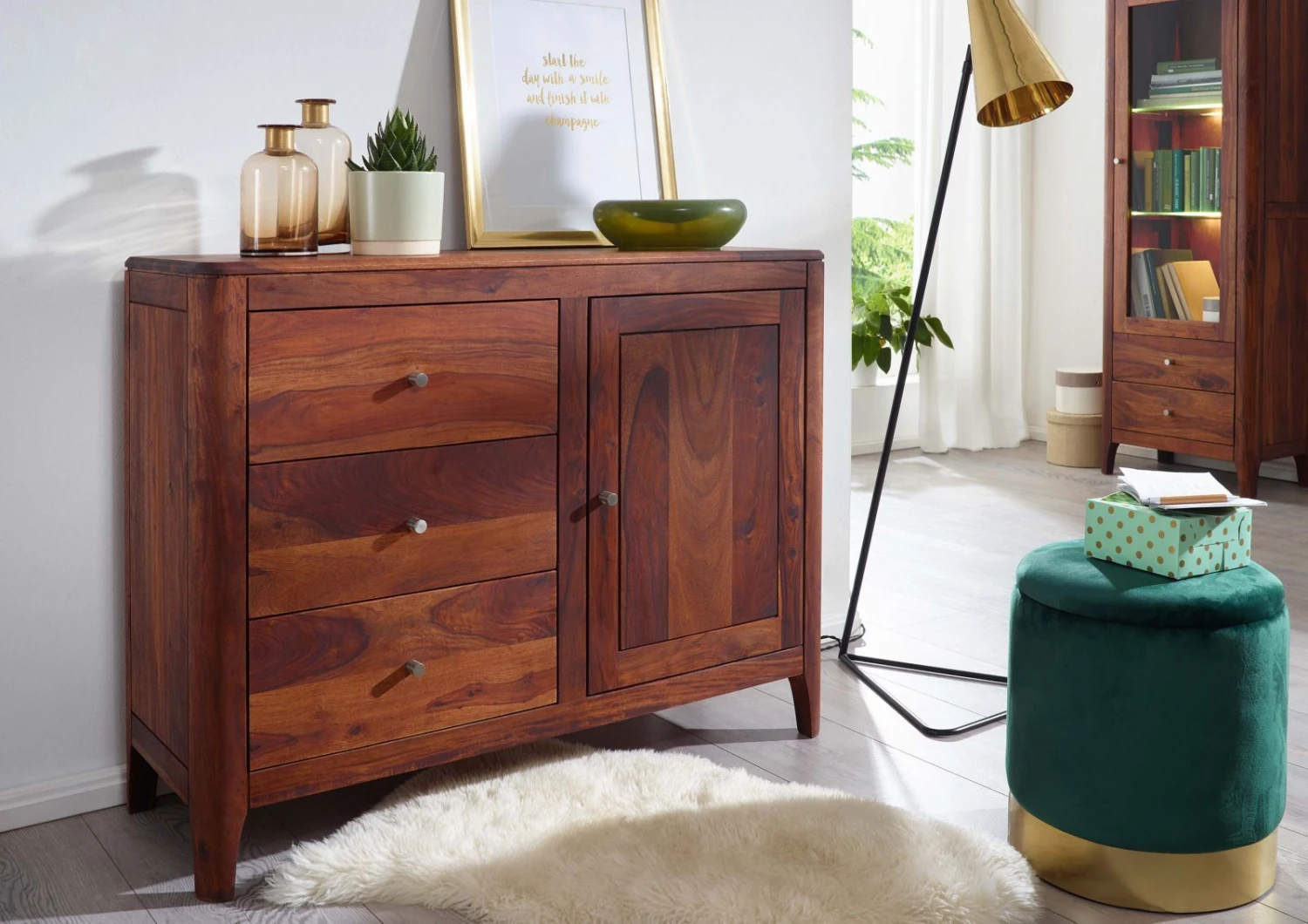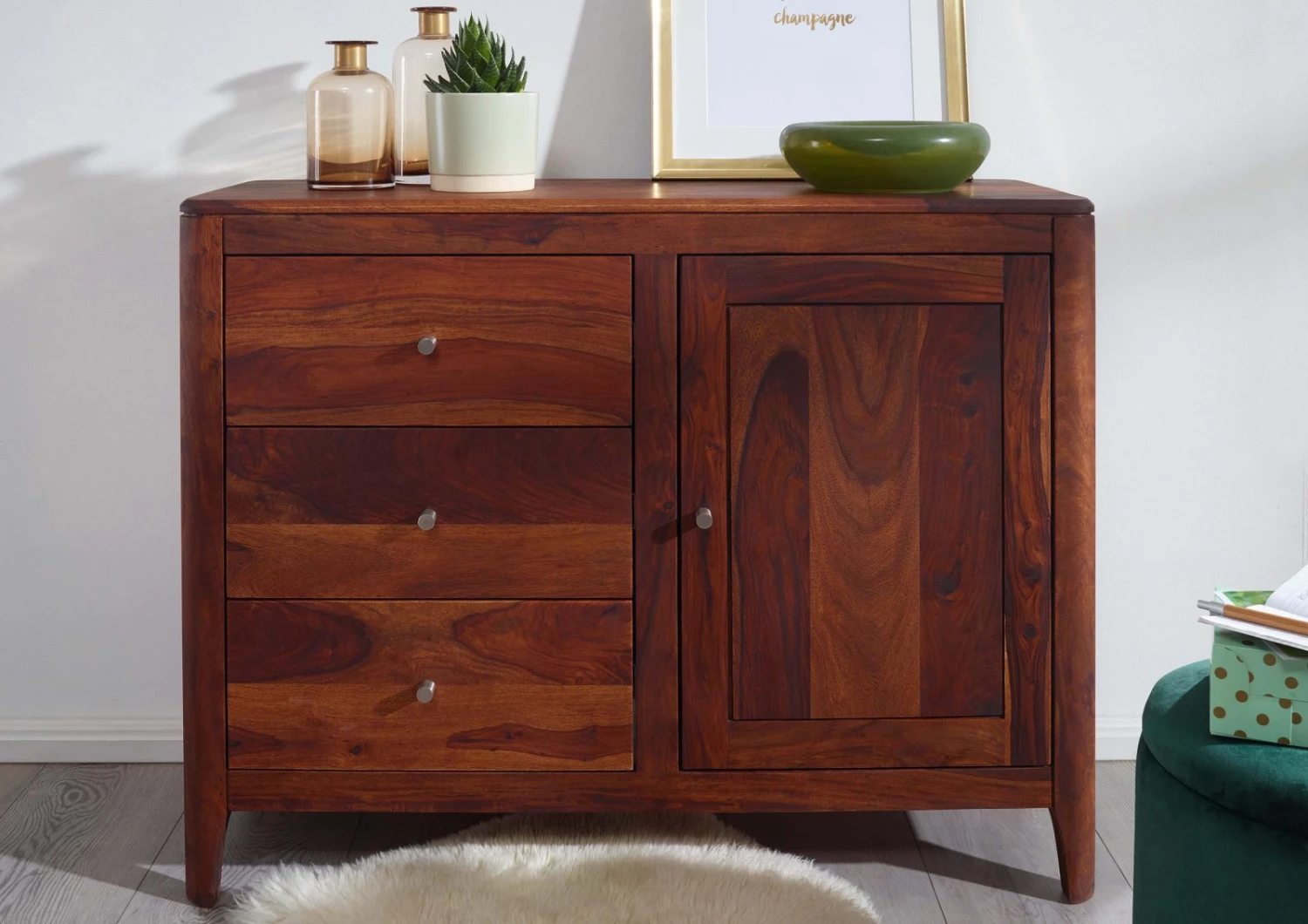 Credenza in legno massello di palissandro con base a zoccolo aperto costituita da quattro gambe di piccole dimensioni ma capaci di garantire eccellente stabilità alla struttura. La superficie, trattata con laccatura per facilitare pulizia e manutenzione del materiale naturale, spicca per il suo intenso color noce dalle autentiche venature e sfumature marrone. Via di mezzo tra comò e credenza in legno massello, questo mobile deve la sua versatilità al design ibrido. Sulla sinistra infatti è possibile notare tre cassettoni su diversi livelli, e sulla destra uno sportello che nasconde due vani di contenimento divisi da unasse centrale. Le aperture a scorrimento sono dotate di carrelli telescopici mentre le maniglie hanno forma di rivetti in metallo lucido. Lo stile moderno abbinato ai dettagli minimali la rendono unottima soluzione darredo per il soggiorno ma anche per la camera da letto.