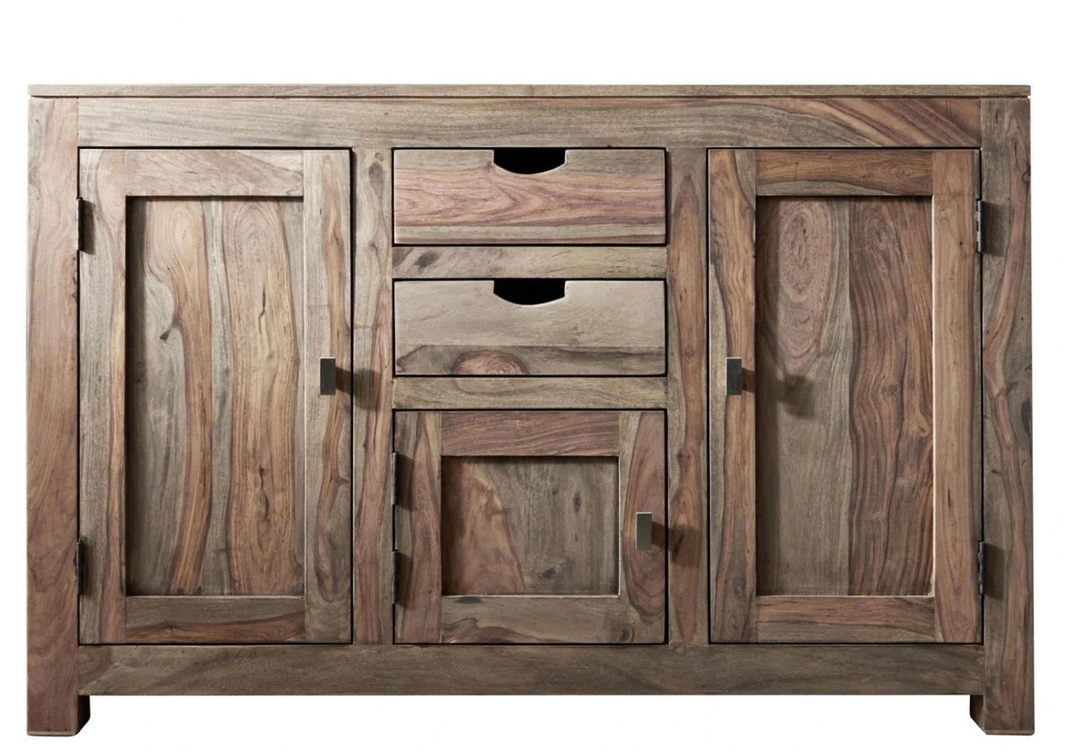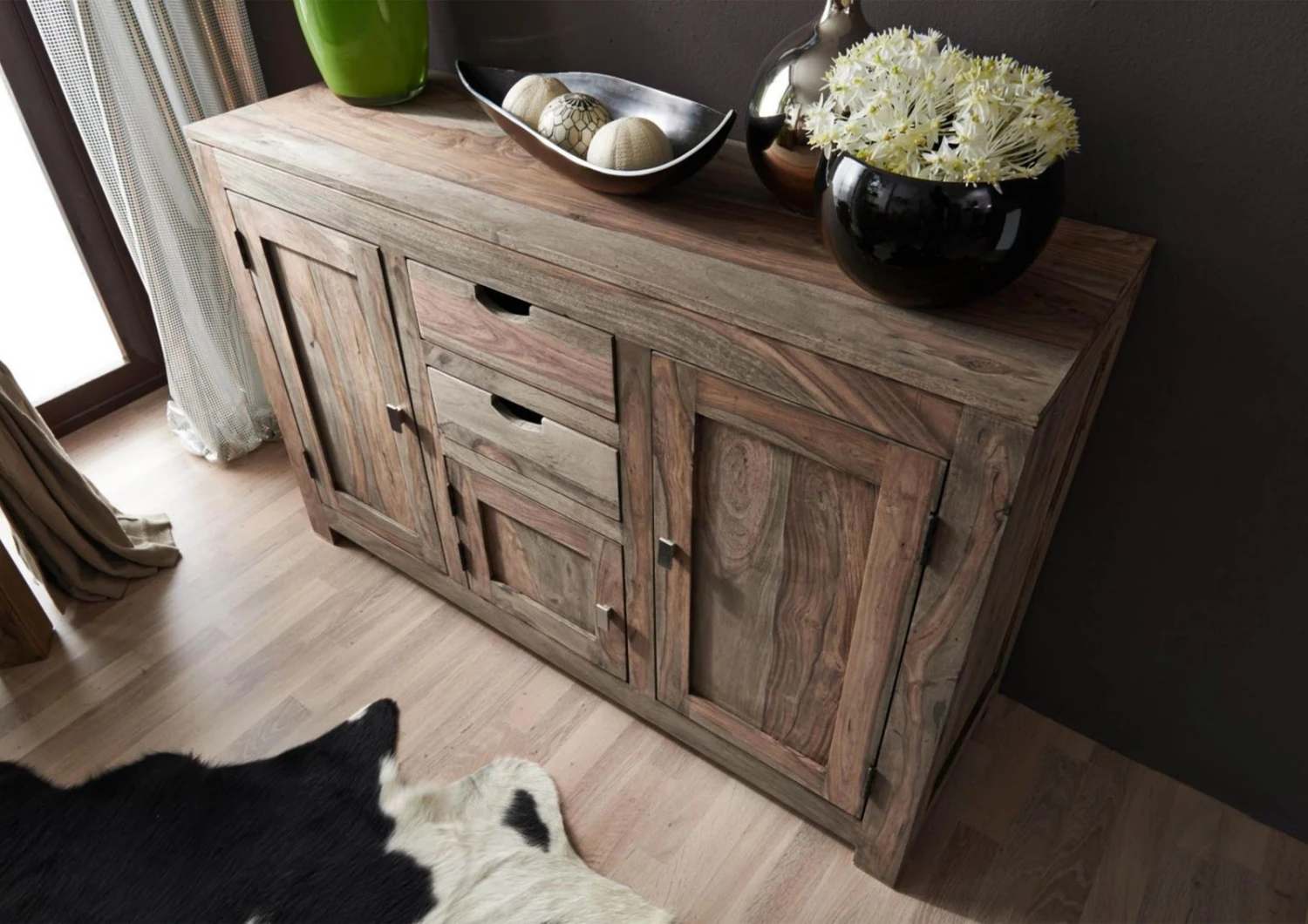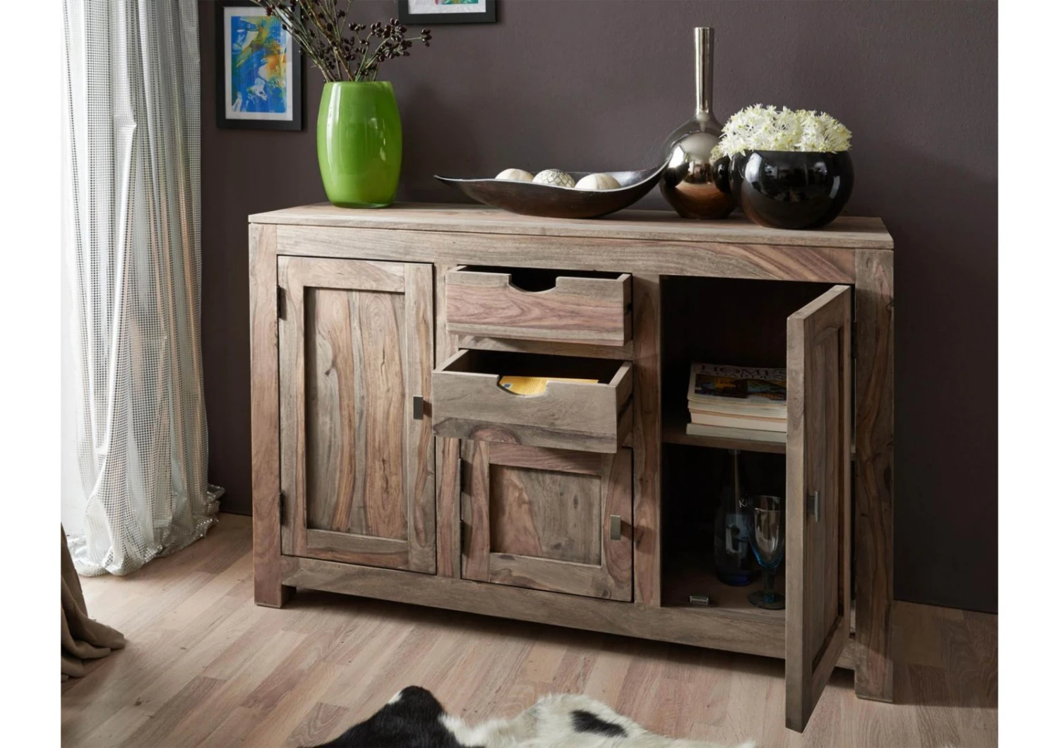 Questa magnifica credenza della linea NATURE GREY non solo vi offrirà un ampio spazio dietro le sue tre ante e nei suoi due cassetti, ma porterà anche un incredibile calore e naturalezza nella vostra casa. Per la realizzazione di questa credenza, è stato scelto un legno nobile apprezzato da decenni e dalle molteplici possibilità di impiego. I mobili realizzati con materie prime naturali e rinnovabili come il legno di palissandro sono degli straordinari pezzi unici. Ciascuna venatura è unica; solo le materie prime con una venatura e una struttura particolarmente vistose e vivaci vengono sottoposte a un’ulteriore lavorazione. In questa linea di mobili, il legno è stato trattato unicamente con dell’olio ed è stata mantenuta la sua colorazione naturale, visibile nelle tonalità del rosso, giallo e marrone. Questa credenza può essere sistemata tra i vostri mobili attuali o essere messa in risalto abbinandola con altri elementi di arredo della linea NATURE GREY. Questa ampia linea di prodotti offre innumerevoli mobili da abbinare a questa credenza come ad esempio vetrine, armadi, tavolini da salotto e tavoli da pranzo. Questa credenza può essere sistemata in qualsiasi ambiente della vostra casa. Potrete integrarla nell’arredamento della camera da letto, del salone o della sala da pranzo, ma anche nella stanza dei bambini, in uno studio o in uno spogliatoio: darà a qualsiasi stanza un aspetto magnifico. Le maniglie dei cassetti, realizzate intagliando il legno, sono sobrie e rendono il mobile poco appariscente. Anche le maniglie delle ante sono delicate e si sposano con le venature.