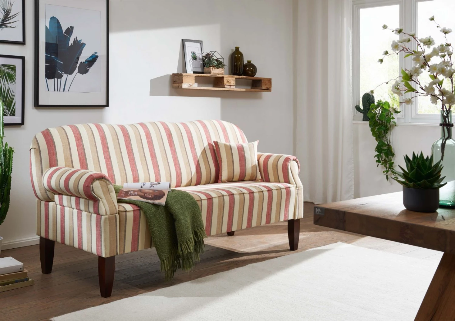 Il divano EDINBURGH è casual ed elegante allo stesso tempo. Il divano poggia su gambe scure e molto alte. La forma rotonda della seduta è particolarmente accattivante. Sia i braccioli che gli schienali sono caratterizzati da una silhouette morbida. L’elemento di spicco del divano è il rivestimento a righe: le ampie strisce dall’aspetto sbiadito donano un look colorato con un tocco rétro.