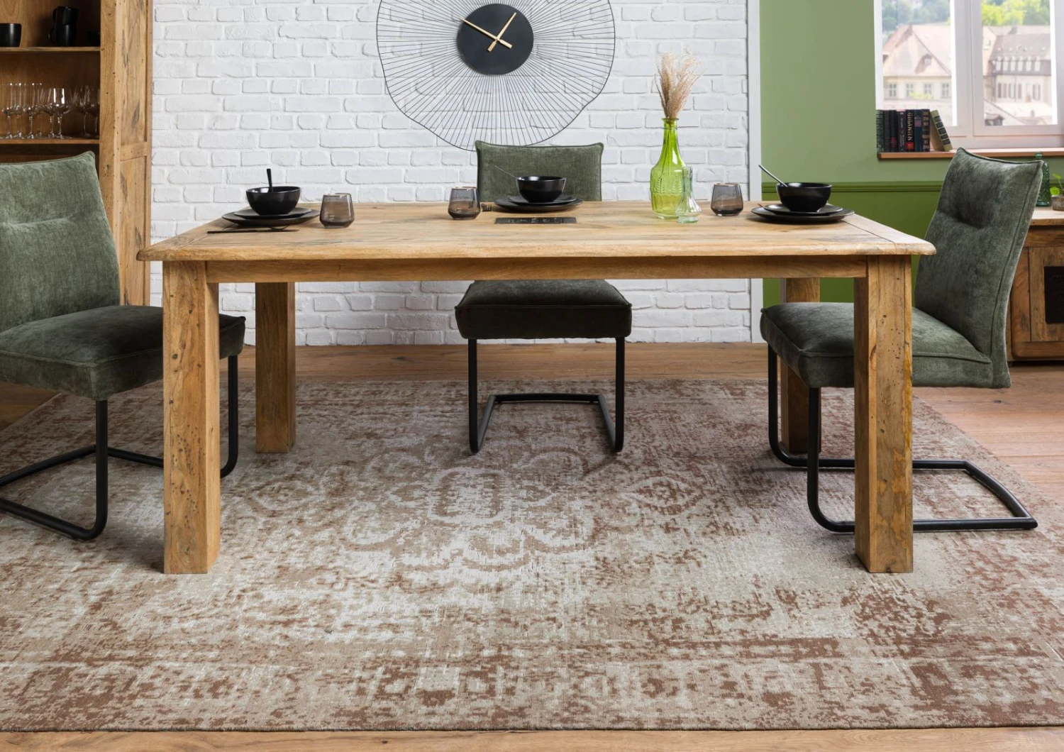 Legno massiccio che conquista: la superficie è stata lavorata in modo da far risaltare le venature naturali del legno. Inoltre, su questo materiale alta qualità sono stati aggiunti piccoli graffi per enfatizzare l’effetto usato di tendenza, che rende ogni singolo tavolo un complemento d’arredamento senza uguali.