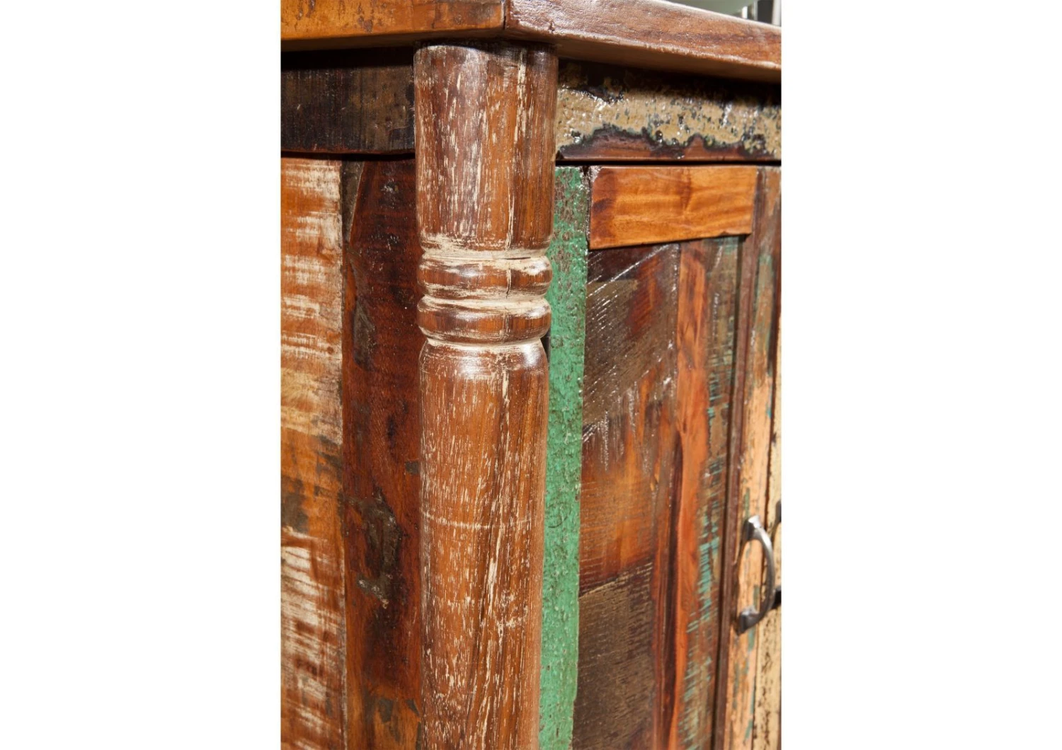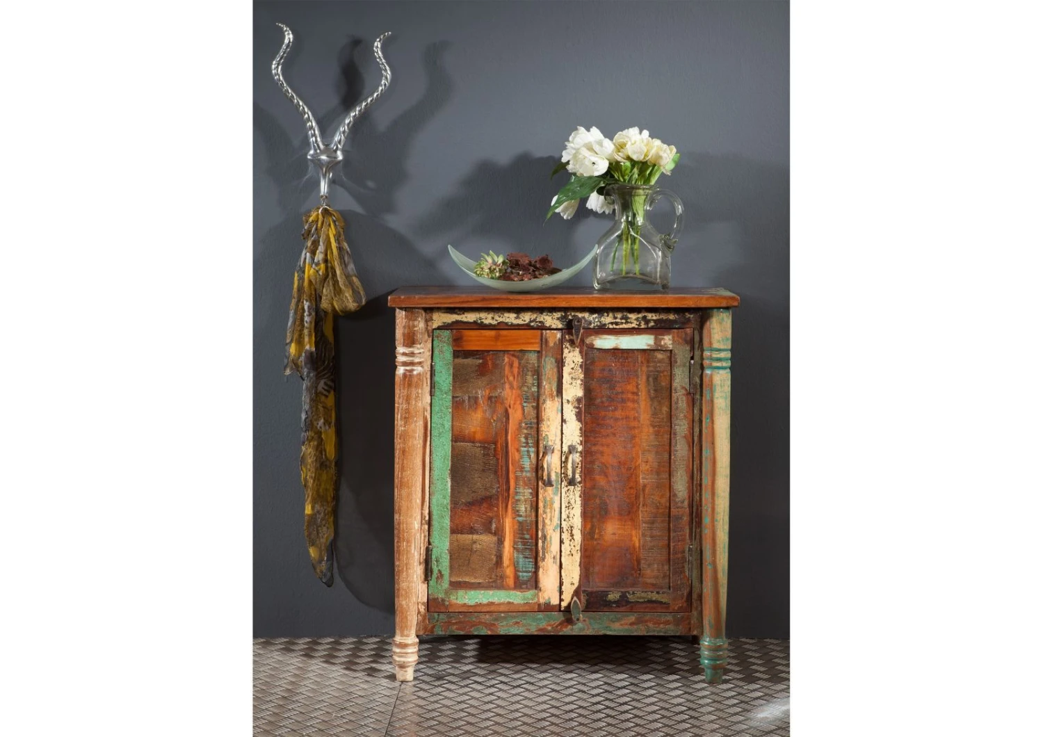 Con questo comodino porterete nella vostra camera da letto un magico romanticismo senza tempo! Il piccolo mobile funzionale vi aiuterà a tenere ordine, fornendo allo stesso tempo un pratico piano d’appoggio vicino al vostro letto. Questo mobile vi offre uno spazio per gli oggetti ed anche una superficie da utilizzare e, contemporaneamente, arricchisce ogni ambiente con il suo aspetto unico. All’interno del comodino si possono conservare, lontani dagli sguardi, tutti i piccoli oggetti, mantenendo così l’ordine nell’intera camera da letto. Da non sottovalutare il piano d’appoggio che è estremamente utile nel quotidiano. Su di esso può trovare spazio una lampada oppure si può tenere una sveglia a portata di mano. Nella lavorazione di questo prezioso pezzo di arredo è stata data una grande importanza all’unicità, tanto che, ad esempio, sulle gambe del comodino è stata inserita una lavorazione ad intaglio in filigrana. Anche le particolari serrature, nella forma di due piccoli chiavistelli che tengono chiusa la portella sia sopra che sotto, mostrano in maniera fortemente espressiva lo stile vintage. Come tutti gli altri pezzi di questa serie, anche questo comodino è stato realizzato con i legni di vecchi ponti e navi che sono stati sottoposti a complesse lavorazioni per essere trasformati in pregiato materiale di riciclo. Per questo il materiale ed il design si uniscono in maniera impressionante facendo di questo piccolo mobile un pezzo pieno di stile e molto espressivo. Il comodino è stato dotato di un tocco di colore vivo che, grazie alla superficie patinata, richiama lo stile vintage. Inoltre, grazie ad una verniciatura precisa, è stato possibile dare al mobile una protezione ottimale, chiudendo anche i pori del legno di recupero. La superficie liscia ottenuta in questo modo non solo permette una facile pulizia con un panno umido, ma impedisce anche alle particelle di polvere di penetrare nel legno.