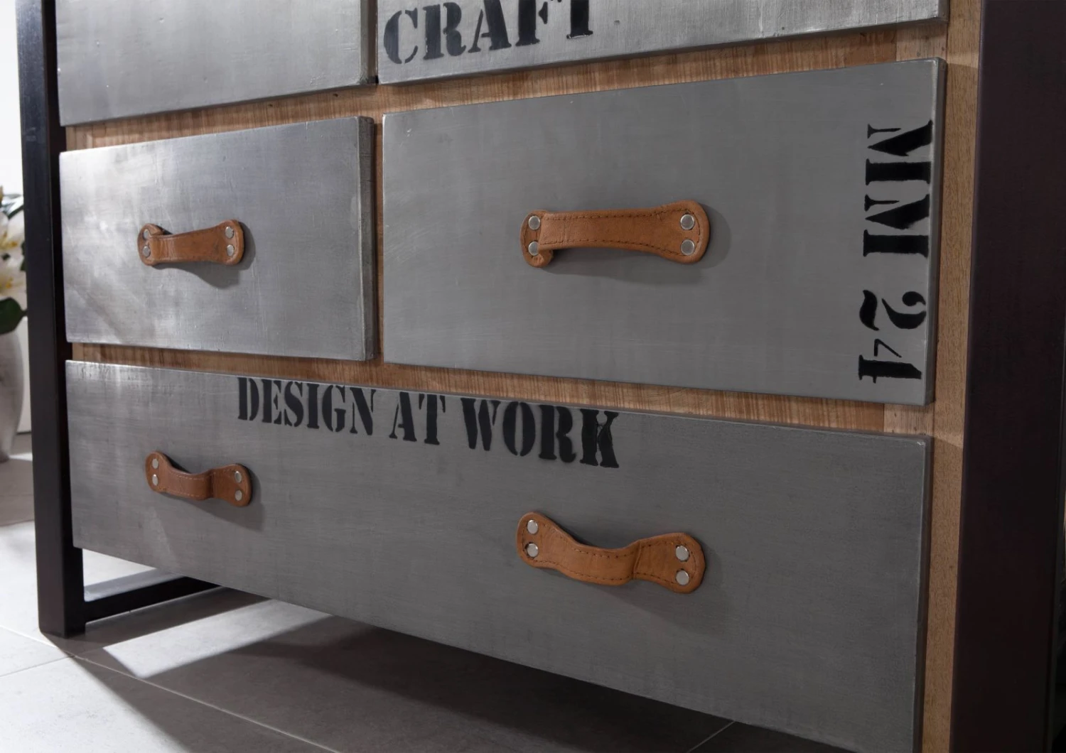 Originale armadio in legno massello di mango colore chiaro tendente al sabbia che mette in risalto lo stile industriale facilmente riconoscibile. Da rilevare il contrasto tra il corpo in materiale naturale e la struttura portante in metallo che arriva fino a terra, creando anche una base dappoggio a zoccolo aperto. Dallalto in basso larmadio in legno massello si presenta con uno scomparto a due ante che rivelano tre ripiani di contenimento. Più sotto sono stati ricavati tre cassetti, uno grande al livello inferiore, e due più piccoli. In corrispondenza di tutti i vani di archiviazione sono visibili dei rivestimenti in lamina di ferro che fanno da richiamo alla struttura, mentre le maniglie sono in cuoio, fissate con viti a testa tonda, con un effetto particolarmente suggestivo.