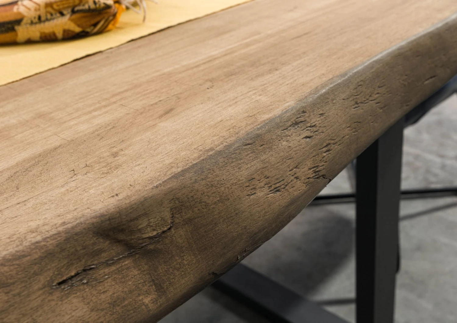Questo tavolo della serie FREEFORM 5 unisce natura e design moderno nella sala da pranzo. Il piano è realizzato in legno massiccio di mango e colpisce non solo per la sua robustezza, ma anche per la sua forma unica. Infatti, ogni tavolo è assolutamente unico grazie al bordo naturale dell’albero, ai nodi, alle piccole crepe e alle irregolarità del legno.