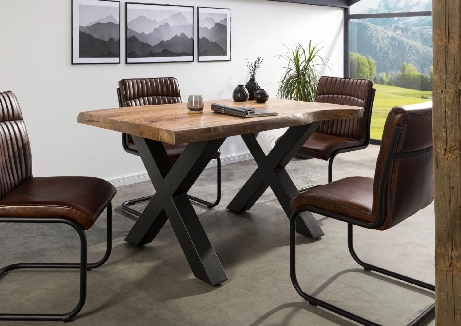Tavolo in legno naturale da 140 cm con bordo irregolare e stile industriale