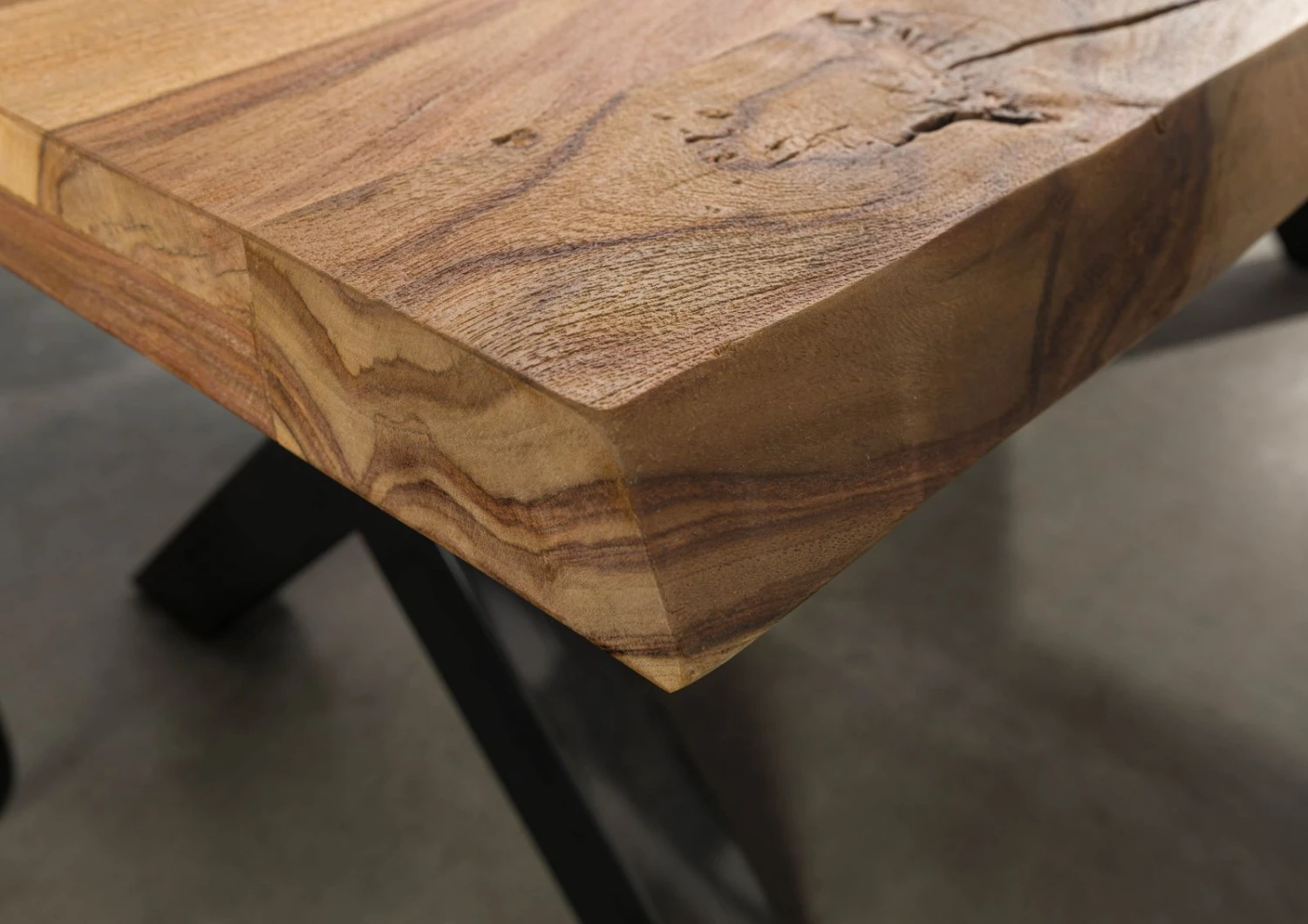 Dotato di bordo a tronco d’albero, Questo questo tavolo porta il popolare stile industriale in qualsiasi sala da pranzo. Il robusto piano e le gambe a X in metallo lucido color antracite sono una potente presenza scenica. Grazie alla superficie sabbiata, il legno ha un effetto straordinariamente naturale e rustico. A differenza dei piani laccati, la versione sabbiata non è completamente liscia, ma presenta piccole rientranze e una sensazione al tatto più genuina. La struttura in legno di sheesham risulta particolarmente valorizzata.