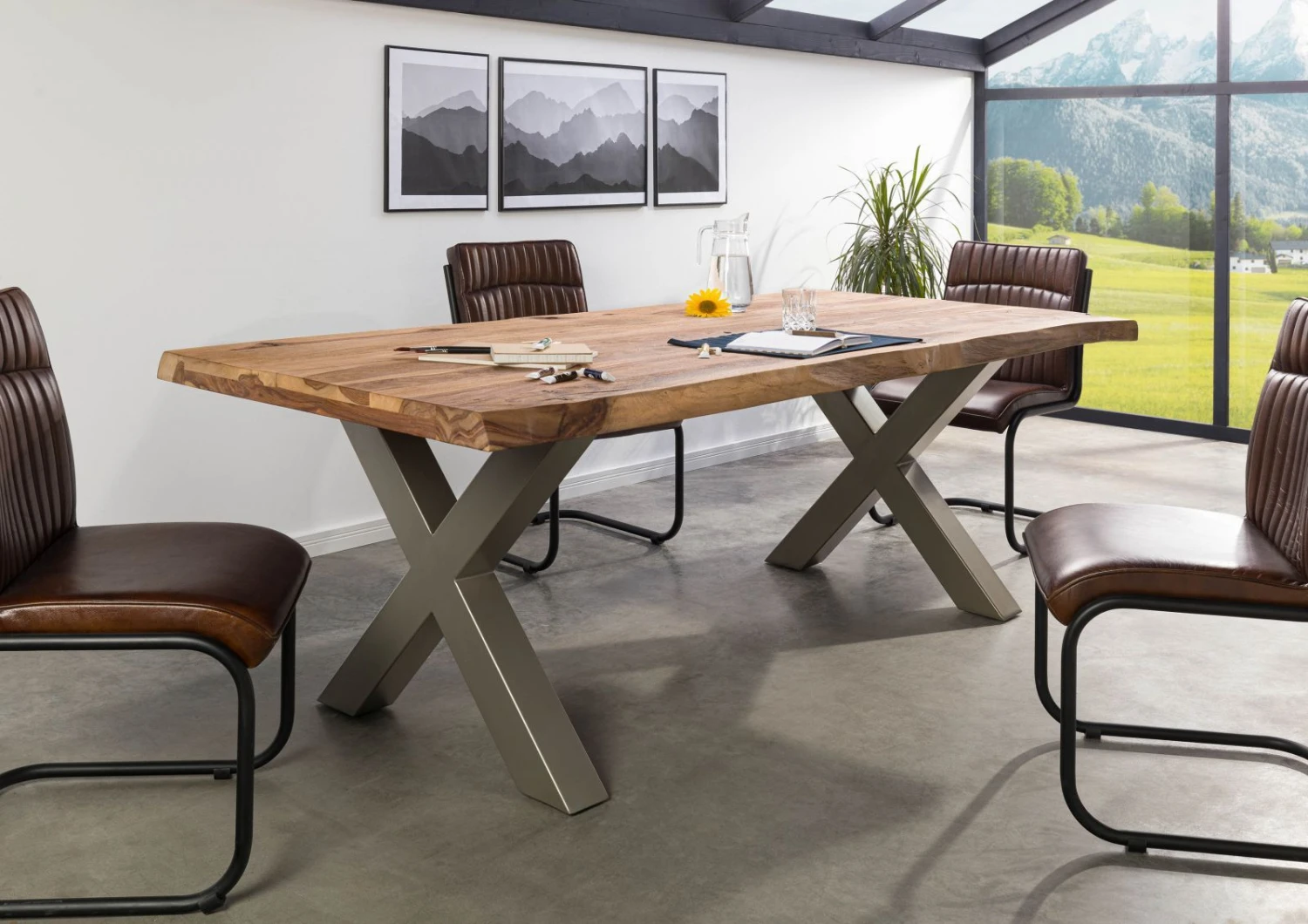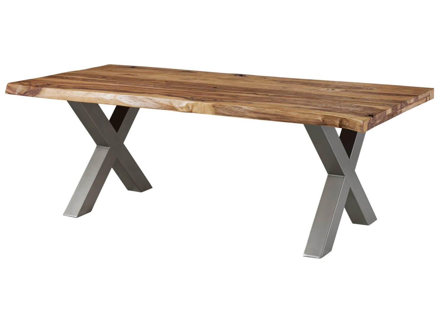 - Tavolo da 200 cm realizzato in legno di sheesham con bordo a tronco d’albero e gambe a X