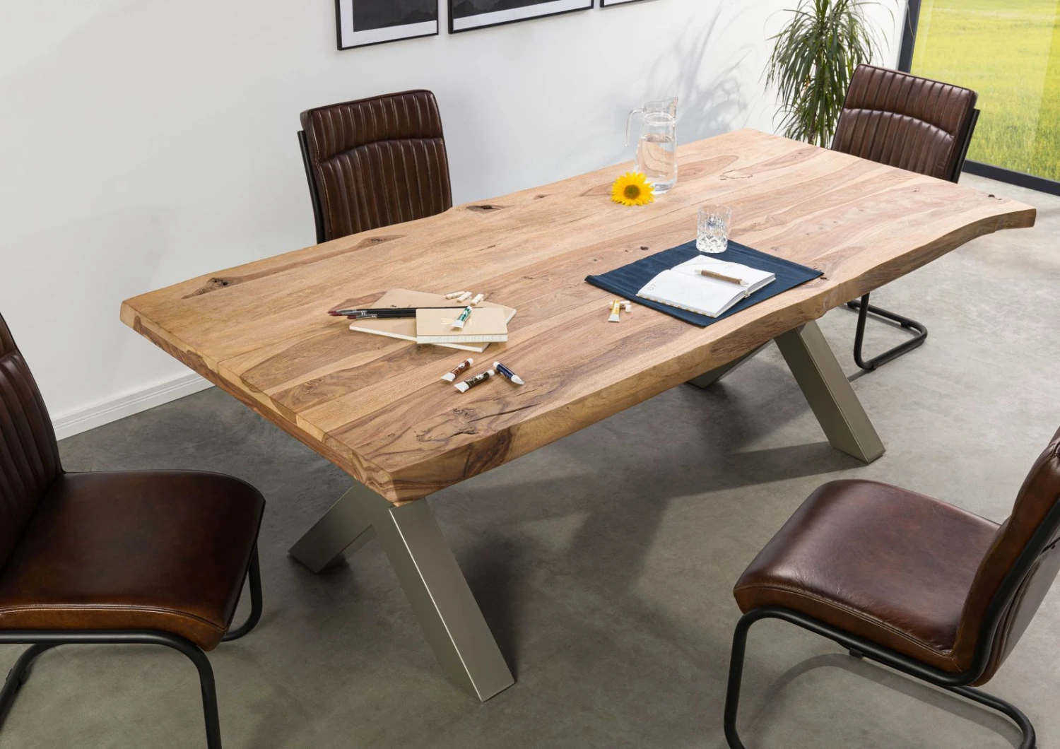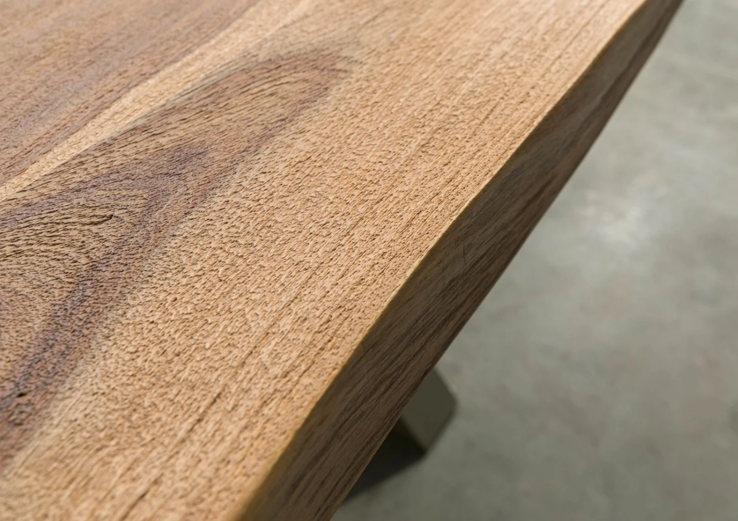 Dotato di bordo a tronco d’albero, Questo questo tavolo porta il popolare stile industriale in qualsiasi sala da pranzo. Il robusto piano e le gambe a X in metallo opaco color argento sono una potente presenza scenica. Grazie alla superficie sabbiata, il legno ha un effetto straordinariamente naturale e rustico. A differenza dei piani laccati, la versione sabbiata non è completamente liscia, ma presenta piccole rientranze e una sensazione al tatto più genuina. La struttura in legno di sheesham risulta particolarmente valorizzata.