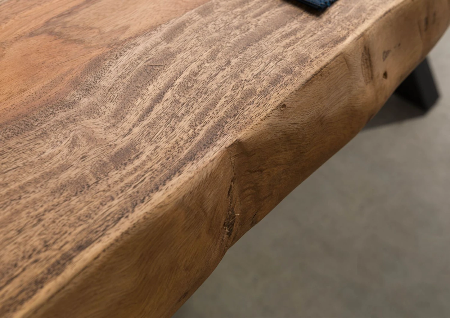 Il legno di sheesham, noto anche come palissandro indiano, è un vero capolavoro naturale: l’alburno e il durame si fondono per creare un risultato unico e incantevole. L’affascinante trama del legno gioca sul fluido susseguirsi di tonalità chiare e scure. Questo tavolo ha un ulteriore dettaglio di design che lo rende ancora più speciale: i lati lunghi hanno il bordo organico e naturale dell’albero.