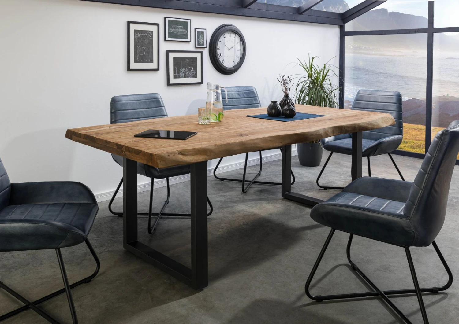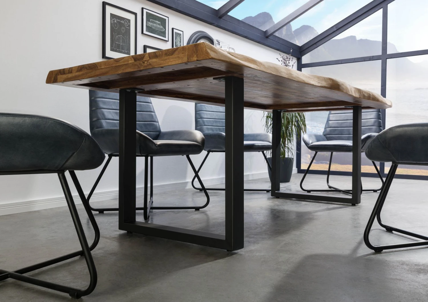 Rustico e contemporaneo insieme: le gambe a U in ferro in antracite opaco conferiscono al tavolo in legno massello di sheesham un design moderno. L’originale accostamento di materiali crea nella sala da pranzo un ambiente suggestivo. Un pezzo unico per l’eternità!
