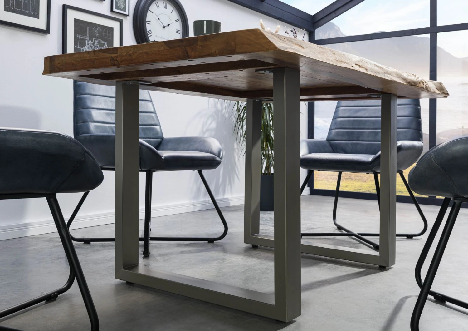 Rustico e contemporaneo insieme: le gambe a U in ferro in argento opaco conferiscono al tavolo in legno massello di sheesham un design moderno. L’originale accostamento di materiali crea nella sala da pranzo un ambiente suggestivo. Un pezzo unico per l’eternità!