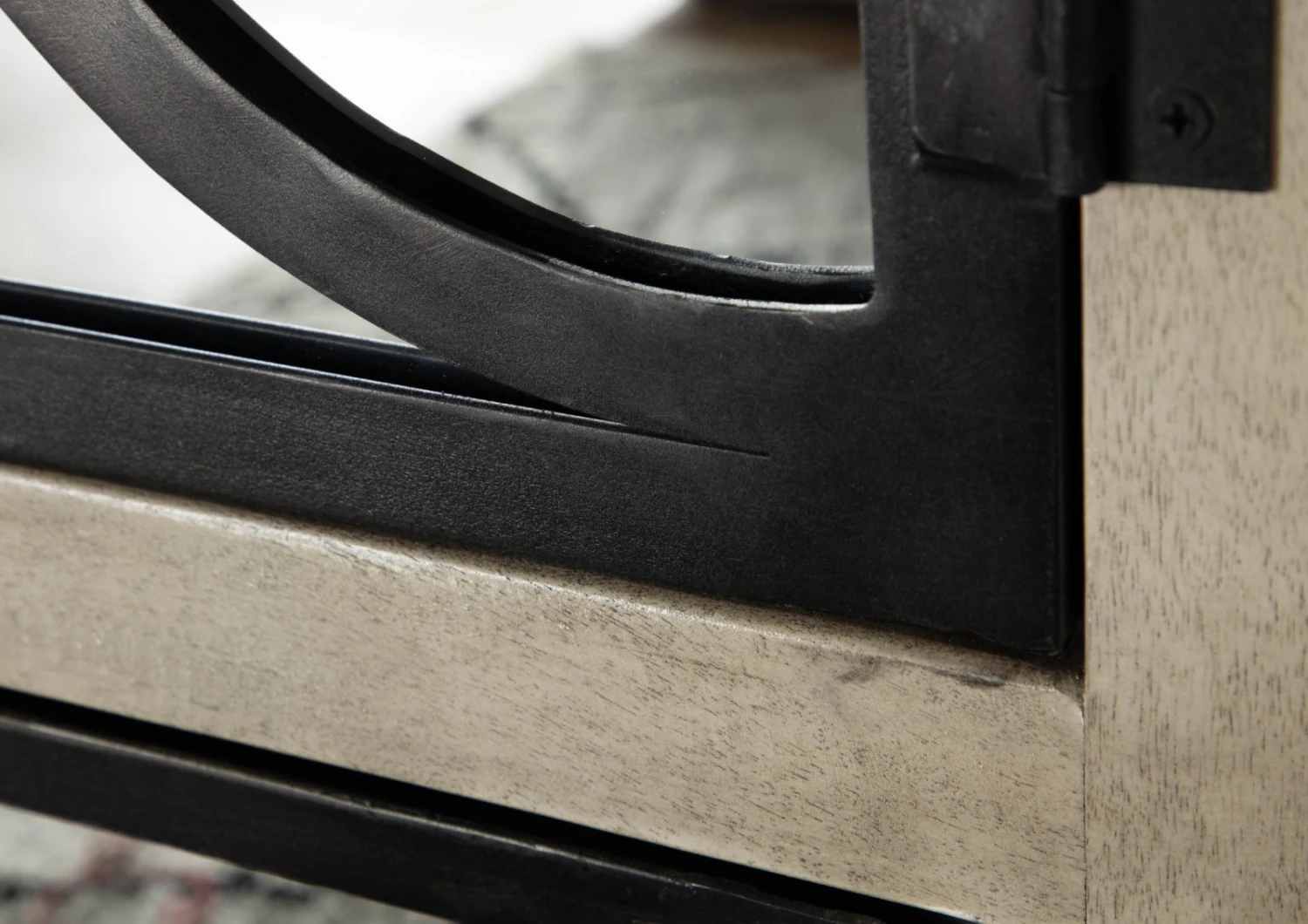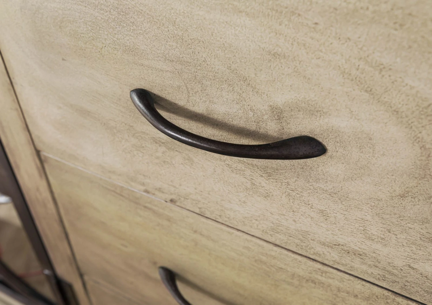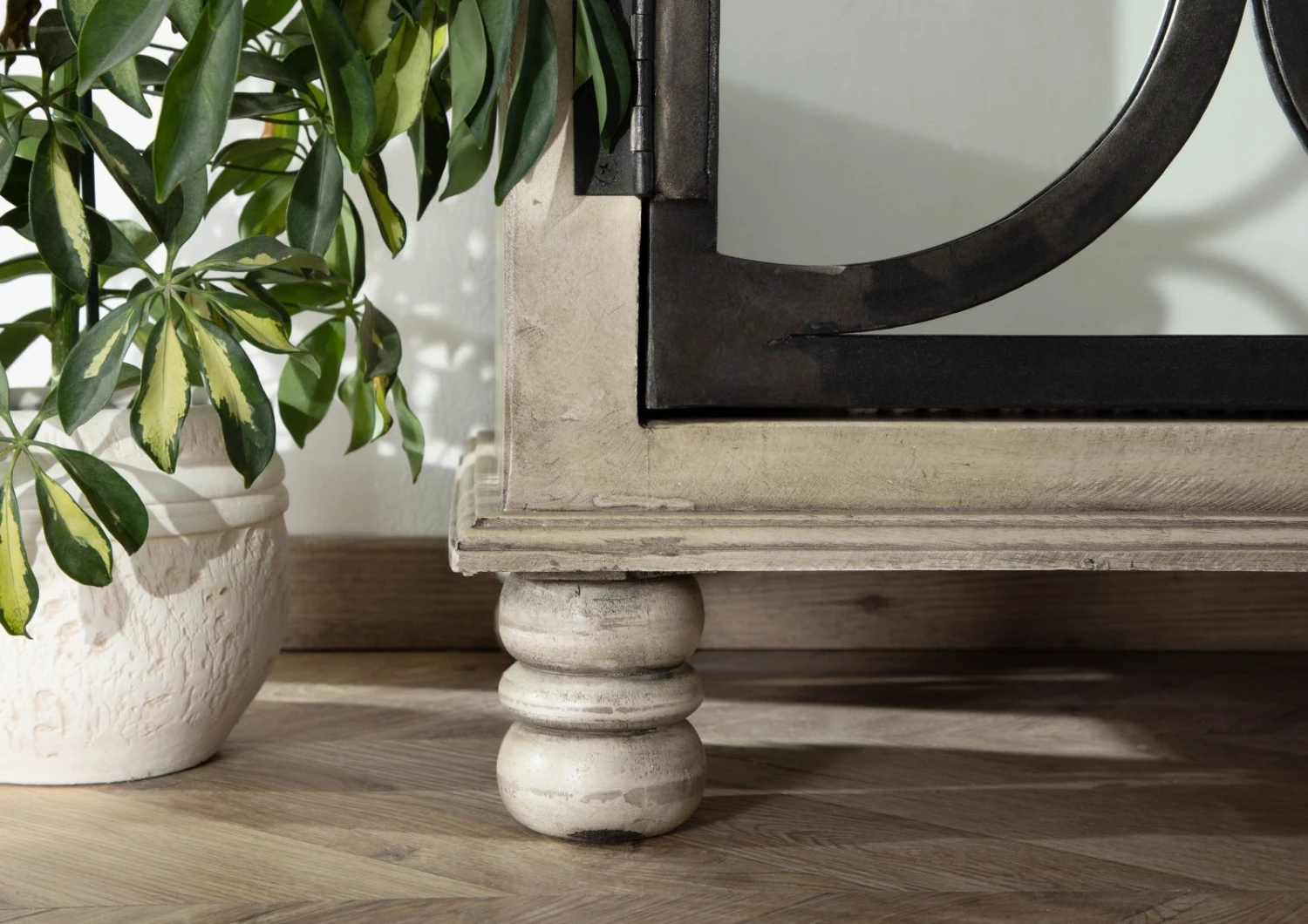 Realizzata in legno di mango, questa solida credenza della collezione HERMITAGE celebra una fusione di stili. La decorazione in ferro scuro impreziosisce il fronte a specchio delle due ante a doppio battente. La forma semicircolare del motivo in metallo ricorda il gusto art déco. Altri dettagli esaltano ulteriormente l’idillio rurale: i piedi a forma sferica e la cornice decorativa che borda la parte superiore e inferiore del mobile creano una romantica atmosfera da casa di campagna.