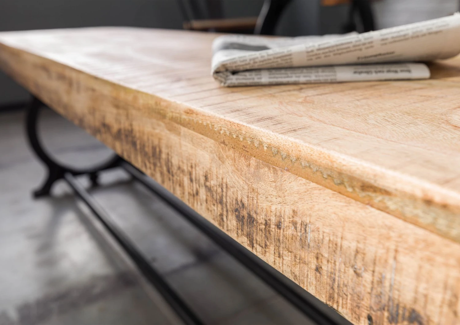 Il legno riciclato da vecchie navi e ponti, è stato trasformato grazie a processi sofisticati, rendendolo una materia prima di alta qualità, conferisce a ogni mobile, un’impressione calda e accogliente, mentre le massicce parti in ferro nero, soddisfano il requisito di stabilità e resistenza, che ha ogni mobile in questa serie.