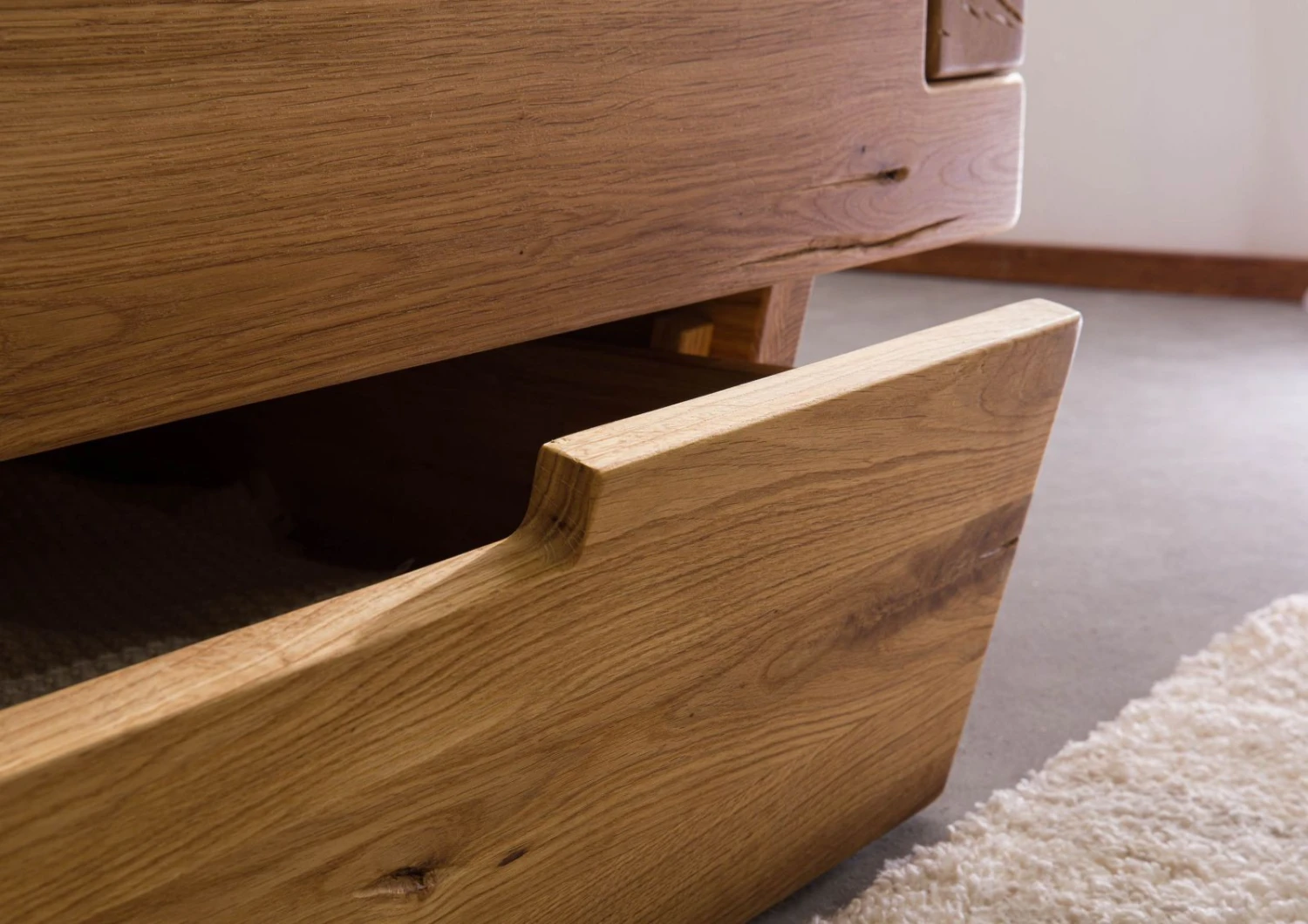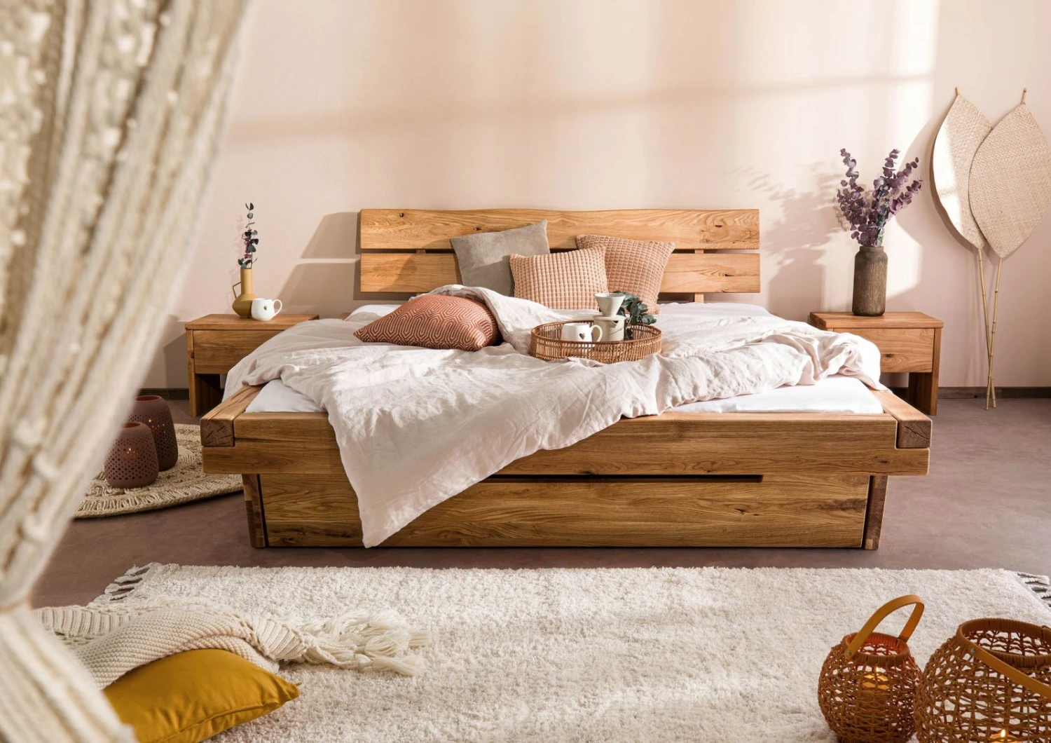 Le calde tonalità cromatiche e il piacevole profumo delle travi in robusto rovere selvatico conferiscono un tocco naturale alla camera da letto. Ogni elemento è caratterizzato da tratti unici, come crepe e nodi naturali, combinati in una ricercata composizione. La finitura con olio di alta qualità mette in risalto irripetibili venature lasciando respirare il legno. Un altro interessante particolare è la testiera con bordo a tronco d’albero, che rende ogni esemplare un pezzo unico.