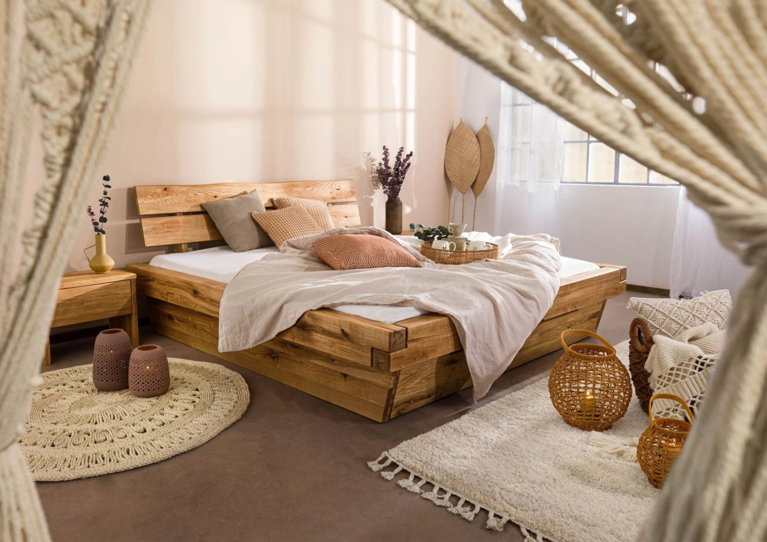 Le calde tonalità cromatiche e il piacevole profumo delle travi in robusto rovere selvatico conferiscono un tocco naturale alla camera da letto. Ogni elemento è caratterizzato da tratti unici, come crepe e nodi naturali, combinati in una ricercata composizione. La finitura con olio di alta qualità mette in risalto irripetibili venature lasciando respirare il legno. Un altro interessante particolare è la testiera con bordo a tronco d’albero, che rende ogni esemplare un pezzo unico.